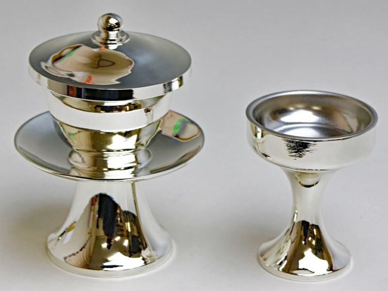 中~大型仏壇(大きめの家具調仏壇から厨子型仏壇)までお使いいただける合金製(シルバーメッキ)の銀色に輝く高級感のある仏器(ご飯入れ)と茶器(お水入れ)のセット商品になります。