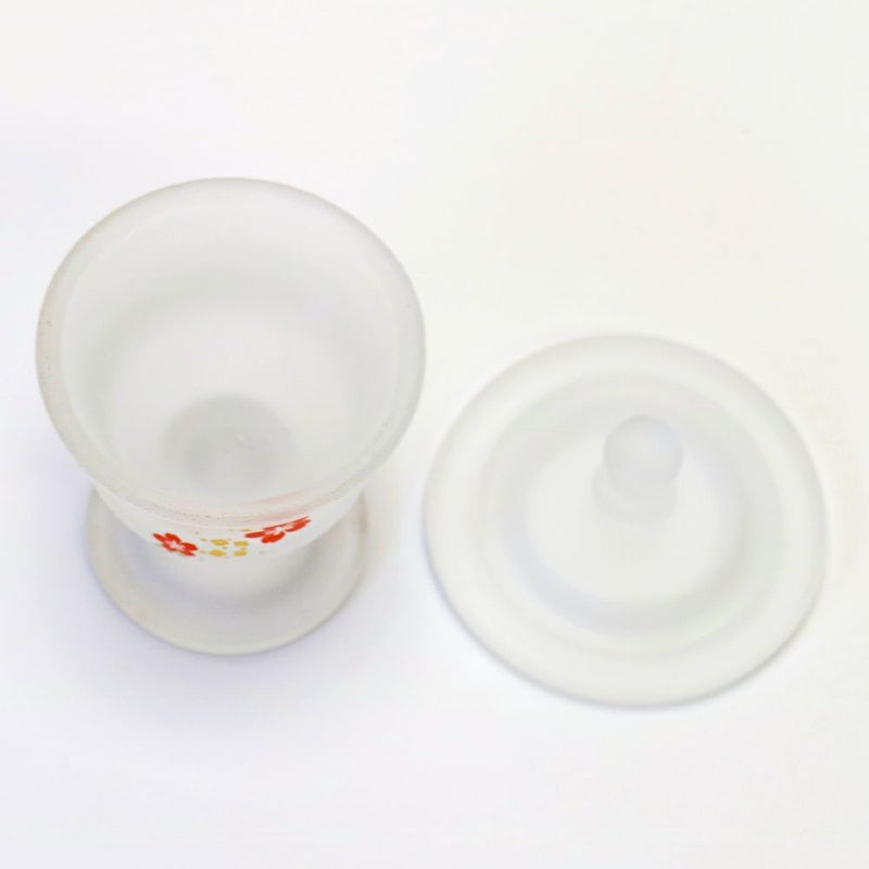 小~中型仏壇(ミニ仏壇からコンパクト家具調仏壇)までお使いいただけるガラス製のかわいらしい桜柄の付いた茶器(お水入れ)になります。