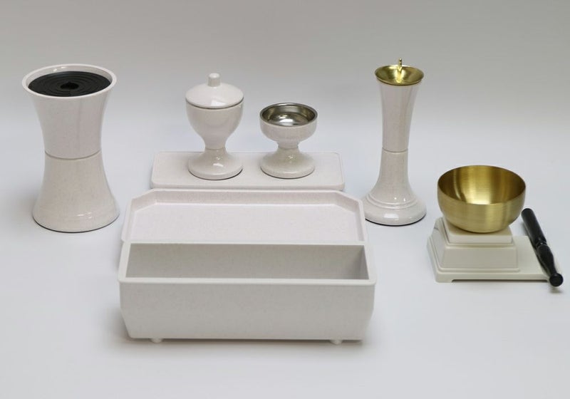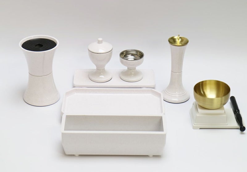 この仏具セットは、小~中型仏壇(ミニ仏壇からコンパクト家具調仏壇)までお使いいただけるプラスティック製のすっきりとしたオシャレな仏具セットになります。