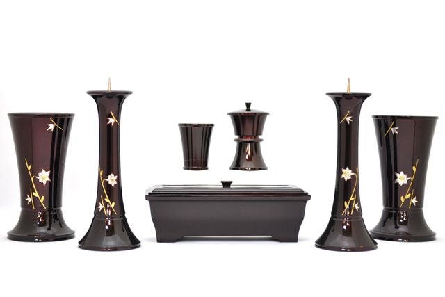 高岡銅器製/仏器・茶器・灯立×2・花立×2・香炉/中型仏壇用/ワイン色/送料別途