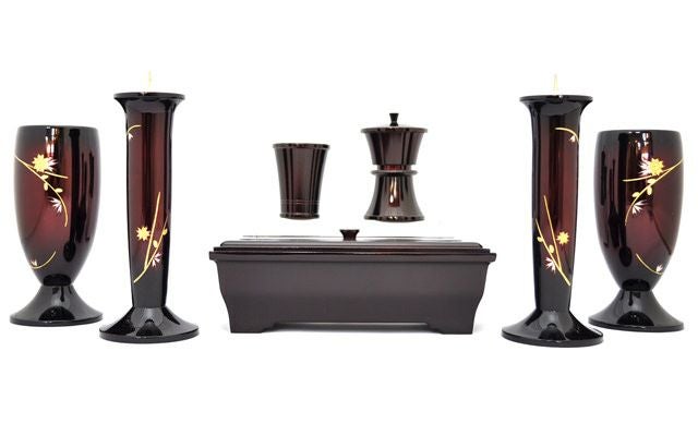 高岡銅器製/仏器・茶器・灯立×2・花立×2・香炉/中型仏壇用/ワイン色/送料別途