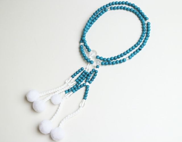 PC(プラスティック製)トルコブルー念珠は約37cmもめん房でしっかり作られています。 丹念に実物の色合いに近く仕上げました。 男性に人気のお念珠です。 メール便配送可能商品です。 ※揉んだり引っ張ったりしますと念珠の紐が切れてしまうので気を付けてご使用ください。