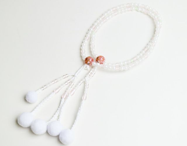 PC(プラスティック製)パール色の仕上げの念珠は約30cmもめん房でしっかり作られています。 パールに白百合の入った、かわいい色合に仕上げました。 清純で気品のある白百合の花は幸福博士の異名かと。 メール便配送可能商品です。 ※揉んだり引っ張ったりしますと念珠の紐が切れてしまうので気を付けてご使用ください。