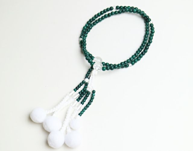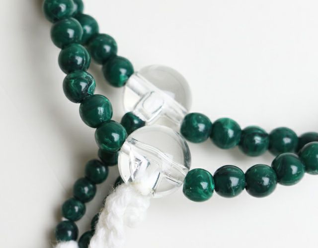 PC(プラスティック製)PC孔雀石は約30cm 、もめん房でしっかり作られています。 個性的な色合に仕上げました。 個性豊かな人生にこそふさわしい念珠です。あなたの夢実現のために! メール便配送可能商品です。 ※揉んだり引っ張ったりしますと念珠の紐が切れてしまうので気を付けてご使用ください。