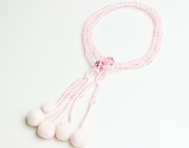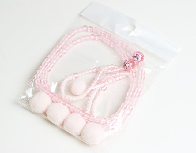 PC(プラスティック製)ピンク色の仕上げの念珠は約28cm もめん房でしっかり作られています。 ピンク・桜の入った、かわいい色合に仕上げました。 桜の花をあしらった、かわいいピンクの念珠です。 すべての女性が福徳豊かに幸福に! メール便配送可能商品です。 ※揉んだり引っ張ったりしますと念珠の紐が切れてしまうので気を付けてご使用ください。