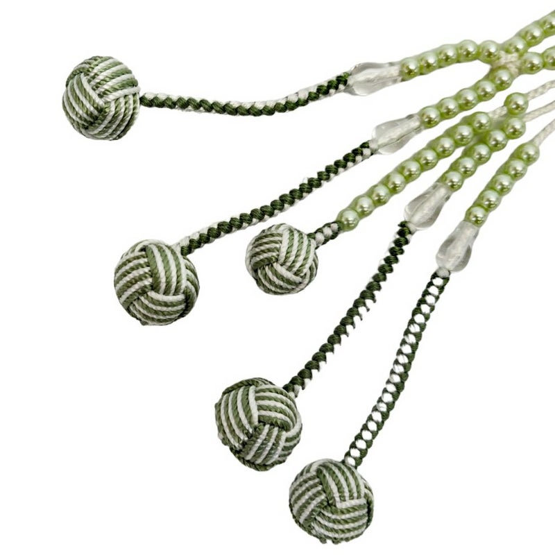 ボンボン部分がしっかりと編まれております。 こちらの編み方を、「かがり梵天房」(かがりぼんてんふさ)と言い、綿の房と違い、堅くしっかり編まれておりますので、型崩れせず、長持ちします。 念珠の色はくすみカラーのグリーン色になります。 しっかりした商品なので、プレゼントにも最適です。 親玉から親玉の長さは約28cmです。 メール便配送可能商品です。 ※揉んだり引っ張ったりしますと念珠の紐が切れてしまうので気を付けてご使用ください。