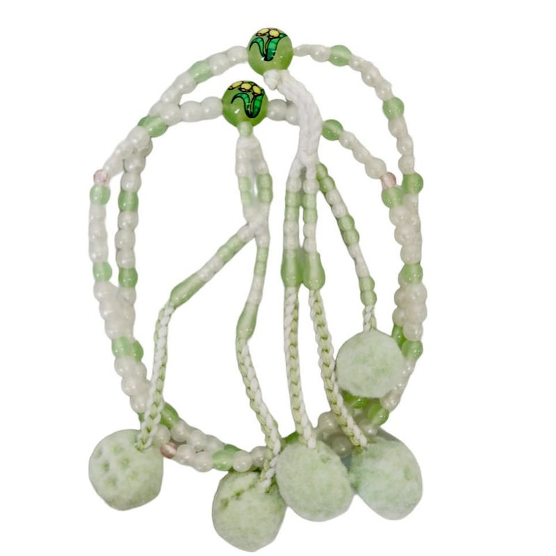 PC(プラスティック製)グリーン色の仕上げの念珠は約28cm もめん房でしっかり作られています。 グリーン色・パール色が入ったかわいらしいデザインに仕上がっております。 親玉にはすずらんの入った、かわいい色合に仕上げました。 すべての女性が福徳豊かに幸福に! メール便配送可能商品です。 ※揉んだり引っ張ったりしますと念珠の紐が切れてしまうので気を付けてご使用ください。