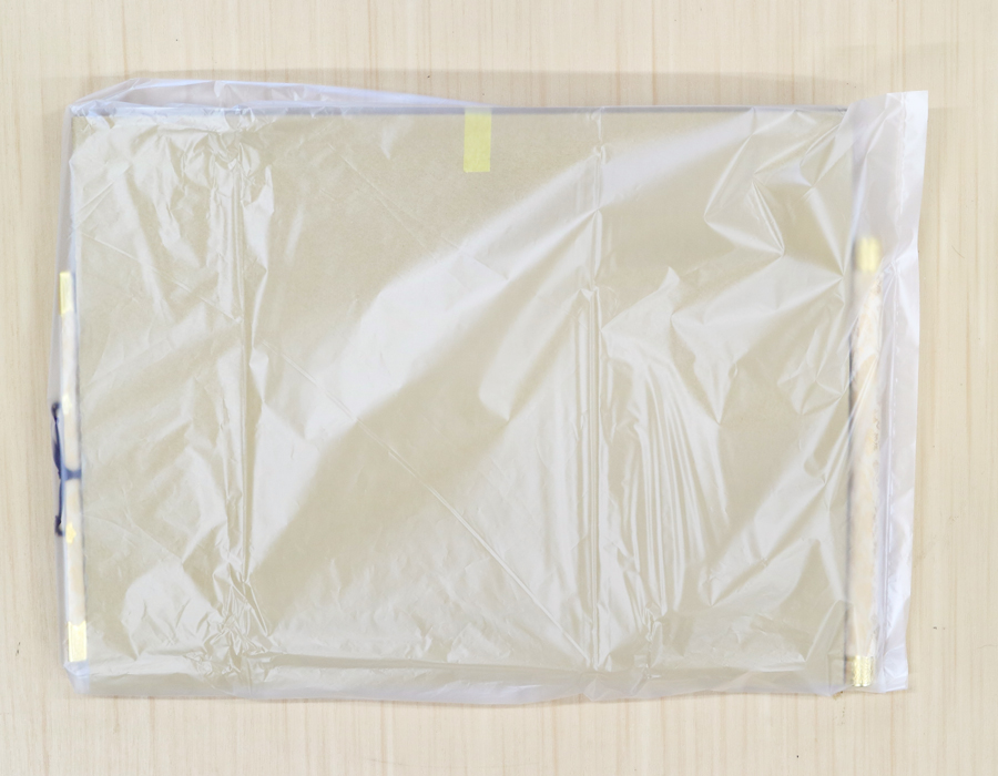 ?A梱包材をめくっていきますと、ビニール袋と二つ折りのダンボールがございます。