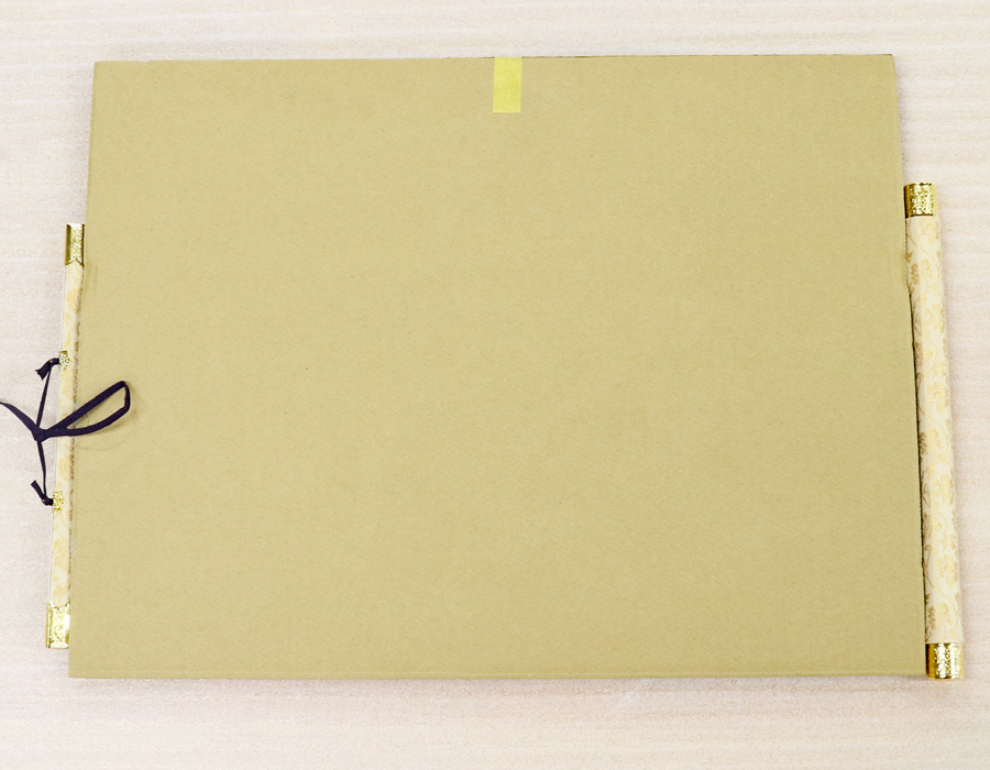 ?B二つ折りのダンボールに、ご本尊様を挟みます。 ※ご本尊様の軸は挟まないでください。