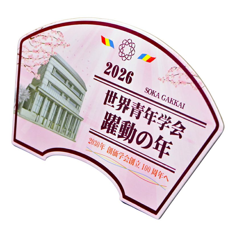 大変お待たせ致しました!!2026年創価学会テーマ【世界青年学会 躍動の年】テーマスタンドの発売開始いたしました。 ★今年のデザインはコレですっっ!! ピンクの色調となっております。文字、枠はキラキラ輝くピンクゴールド。 デザインは昨年に引き続き、創価学会総本部大誓堂をメインに青春桜が舞い散っています。 生涯青春!その心・その気概で2026年も共々に大勝利の一年にしていきましょう。 中央には創価学会の八葉マークが輝いています。 地区の方にも、ぜひまとめていかがでしょうか(*^^*)