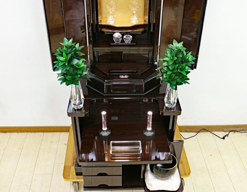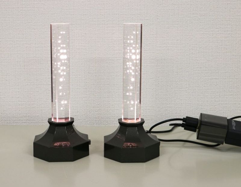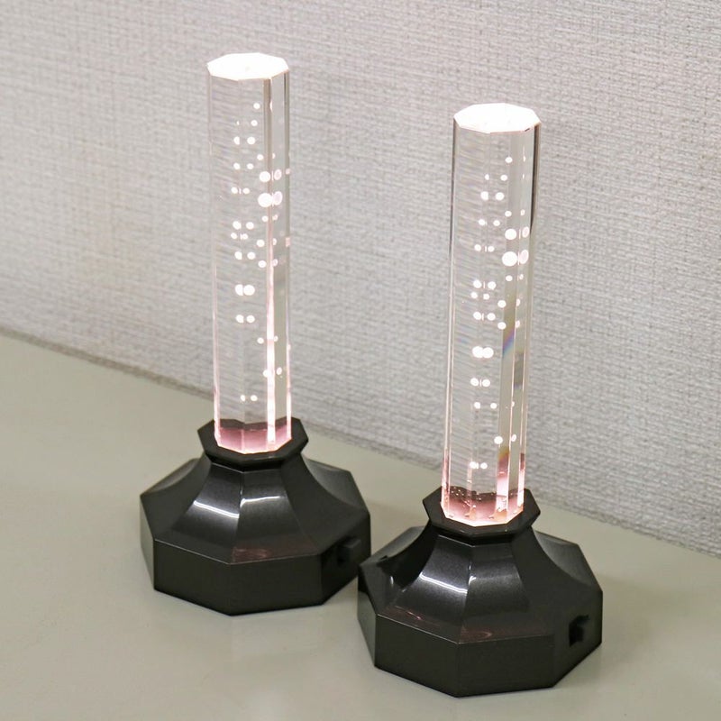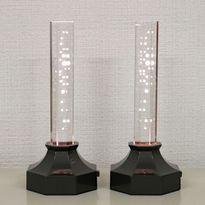 こちらのローソク立ては、大変人気のあるクリスタルガラスのキャンドルになります。 広く包容力のある海の中をイメージしました。 気泡を表現したレーザー刻印をクリスタル内部に施すことで、すっきりとしたクリスタルの造形とともにおだやかで落ち着きのあるデザインとなっております。 キャンドルは、電池・コードの両方に対応しております。 電池の場合はキャンドル1本につき単4電池が3本必要となります。 電池は付属しておりません。 スイッチ式になっており、点灯するとシャンパン色に輝きます。 小型~中型仏壇用(家具調~小さめの厨子型)に最適のサイズとなっております。