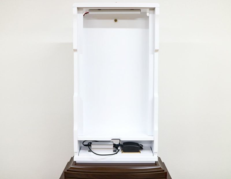 ★特徴は新開発機能の調光フィルム付きガラスが搭載されております。こちらのガラスは電源OFF時はご本尊様が見えない状態ですが、付属のリモコンで電源ONにしますと曇りガラスがパッと晴れてご本尊様が明るく照らされます。