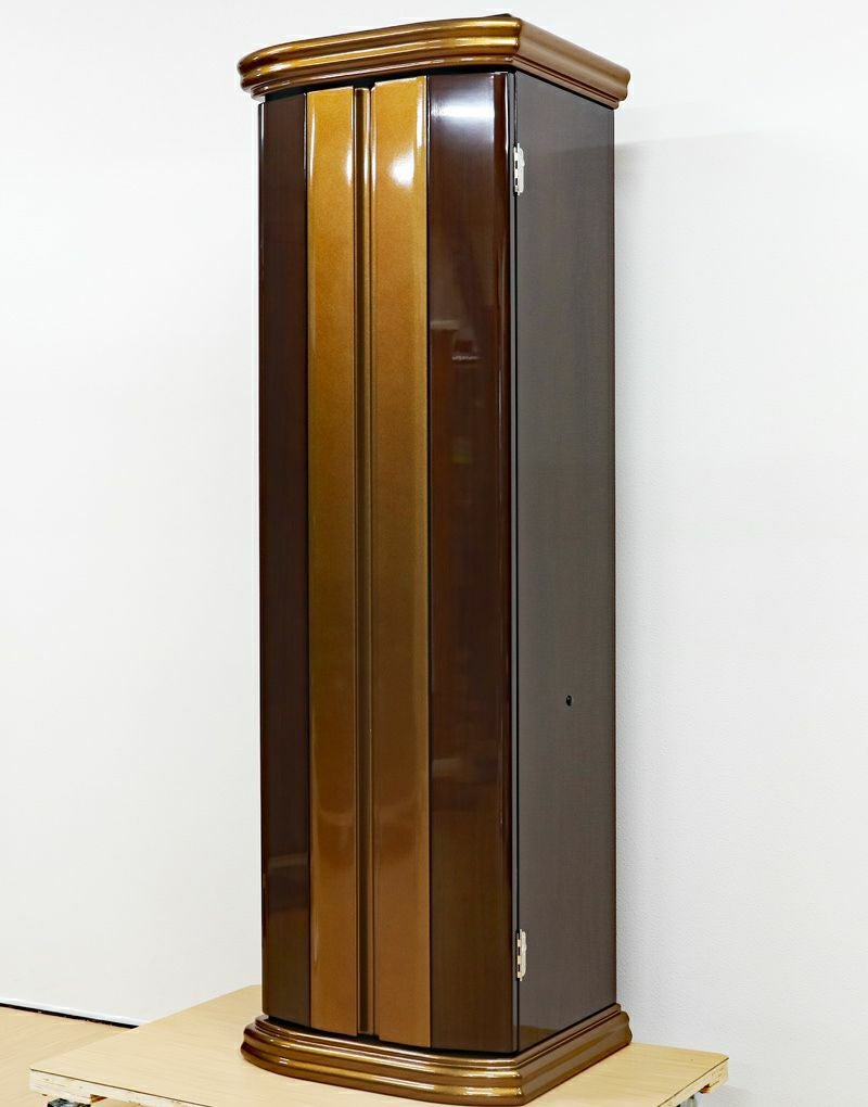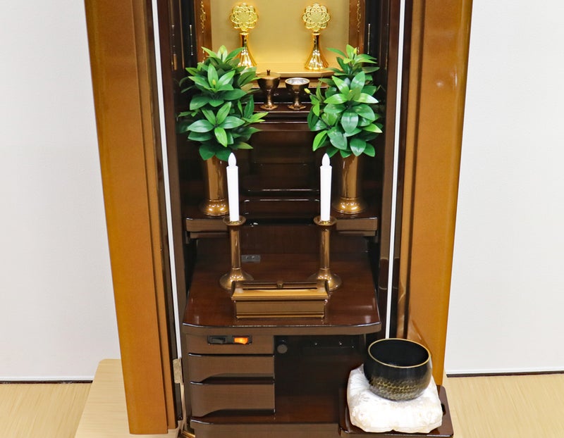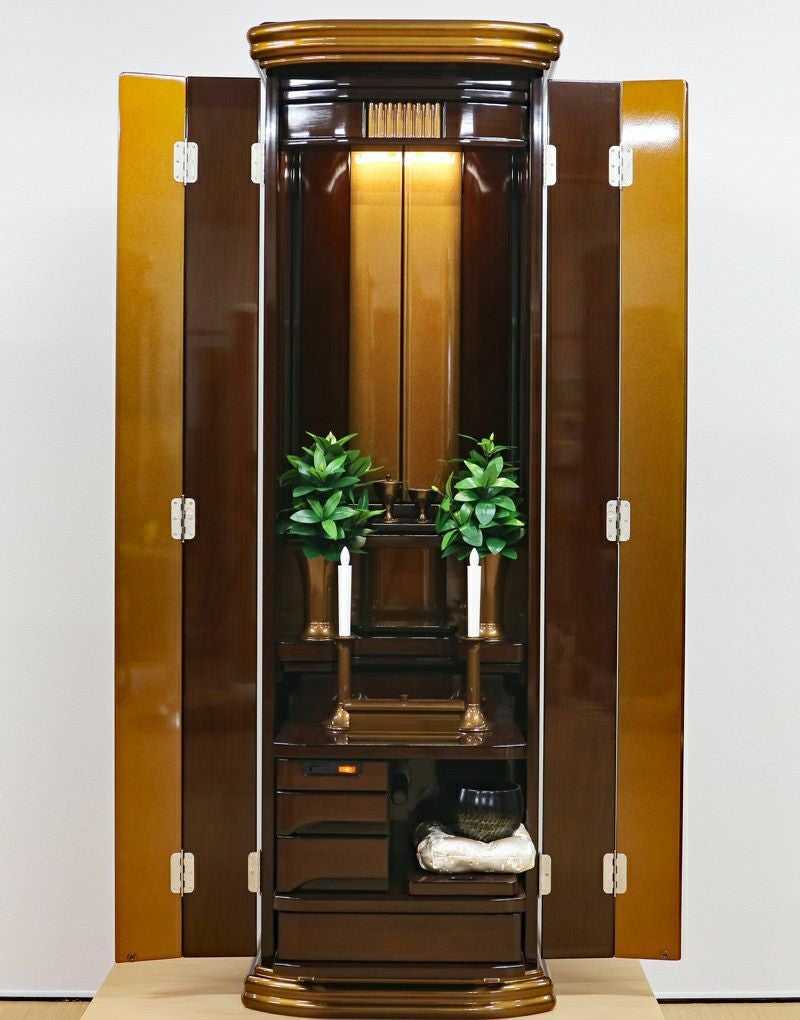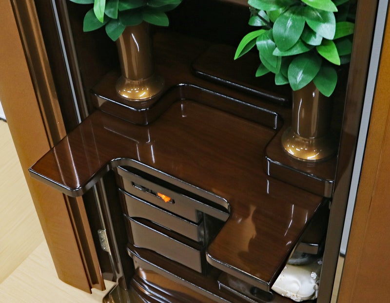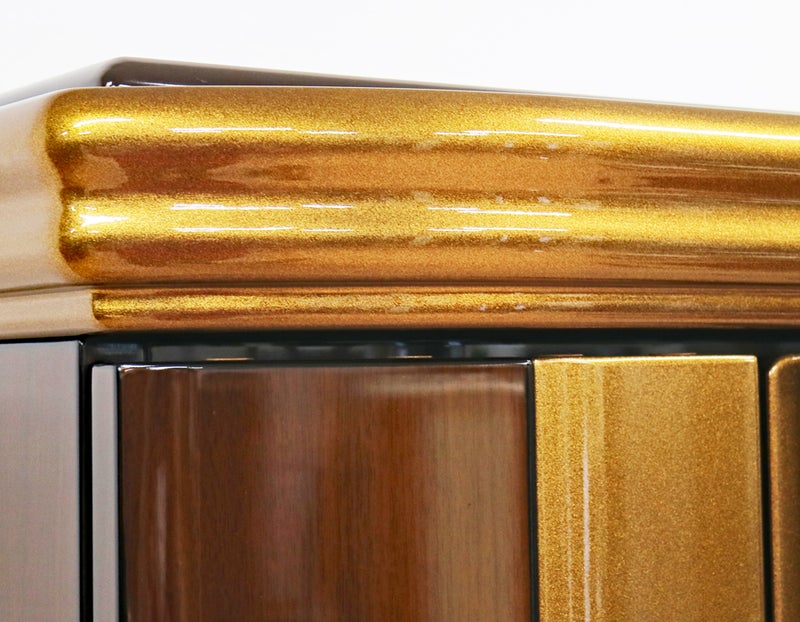 見てください、お厨子の背面に施された美しい円形のゴールド荘厳。最新のプリント技術が生み出す落ち着いたブラウンの木目との対比が、御本尊様をこれ以上なく神々しく、そして温かく包み込みます。