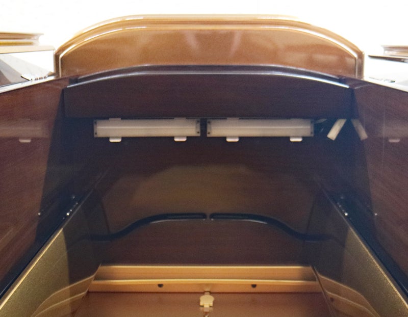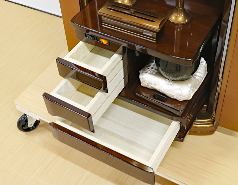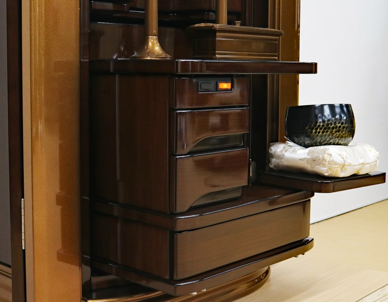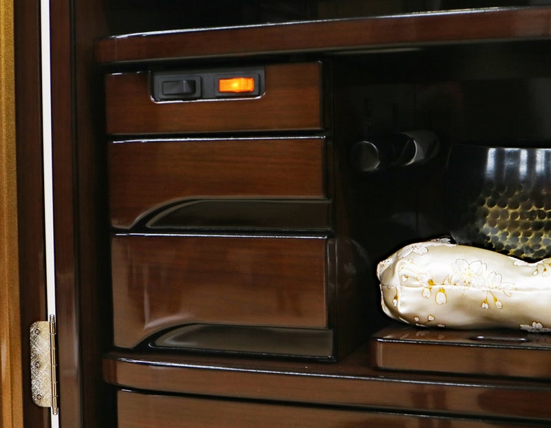 大切な御本尊様をゆとりを持って荘厳できる設計。ボタン一つで静かに開閉する電動扉が、毎日の勤行の始まりをドラマチックに演出。機能美の中に、確かな信仰の歓喜が宿ります。