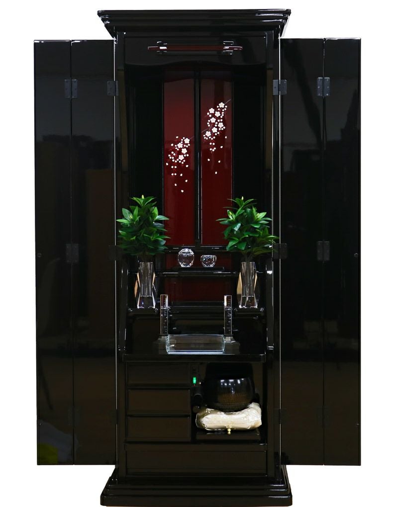 見てください、この「黒とうるみ」の絶妙な色調。漆黒の中にほんのりと赤みが差した、日本の伝統的な『うるみ色』を最新のプリント技術で再現しました。そして扉に描かれた、優美な「しだれ桜」の蒔絵。御本尊様に向かうたび、わが家に勝利の春が訪れたような清々しい心になります。