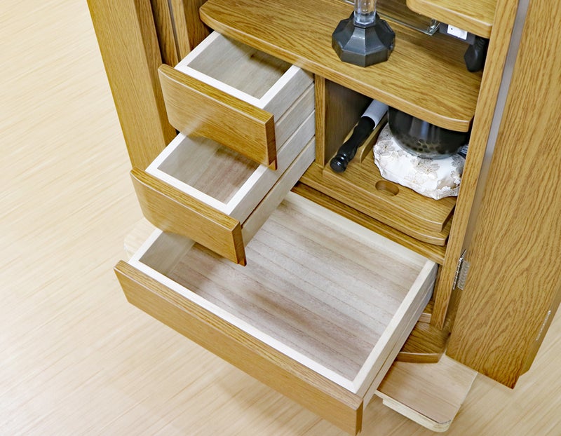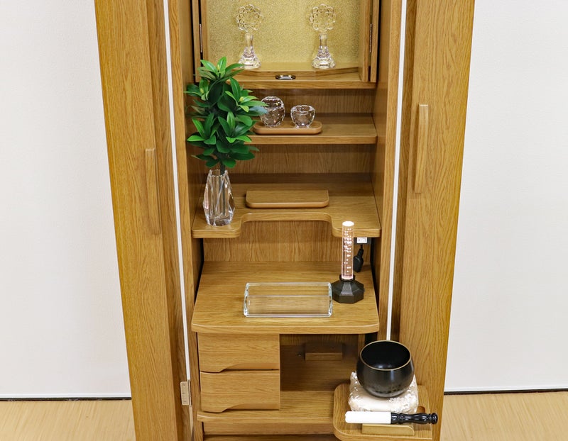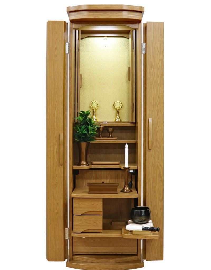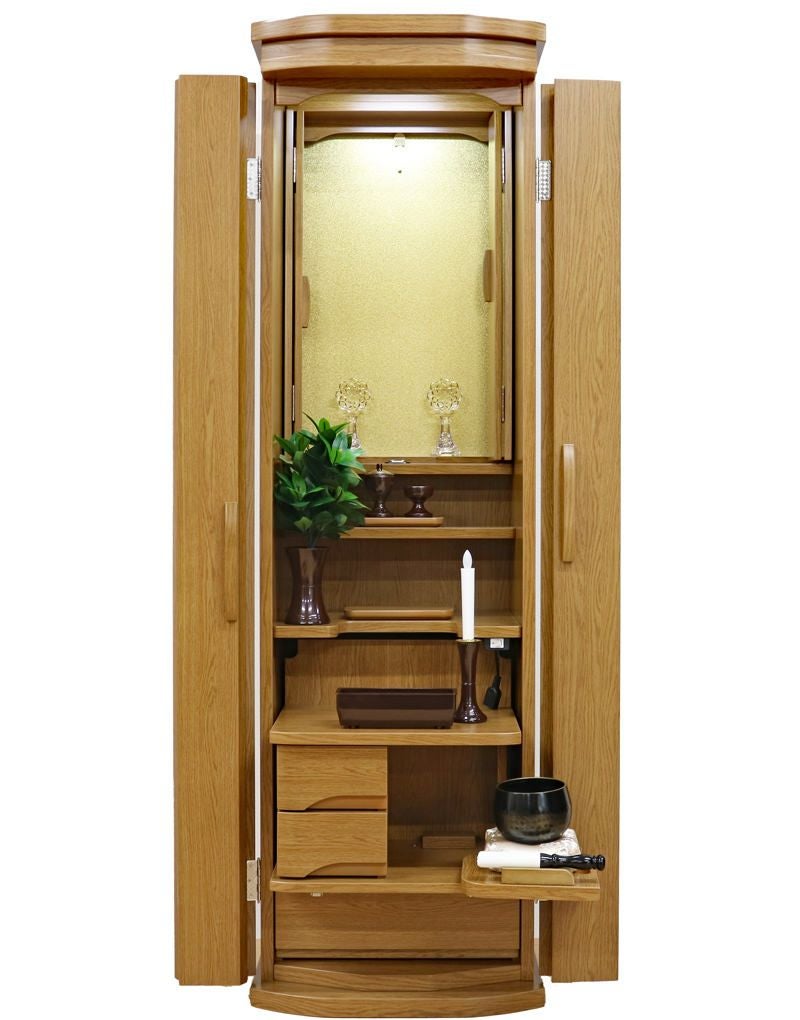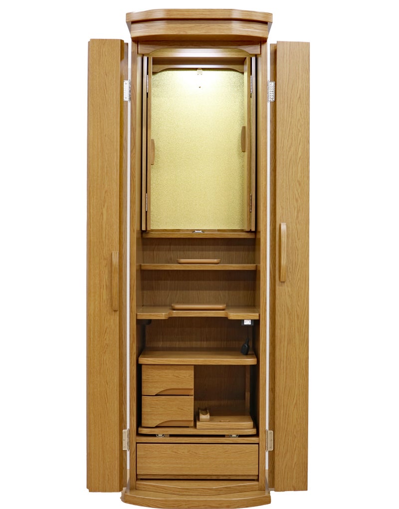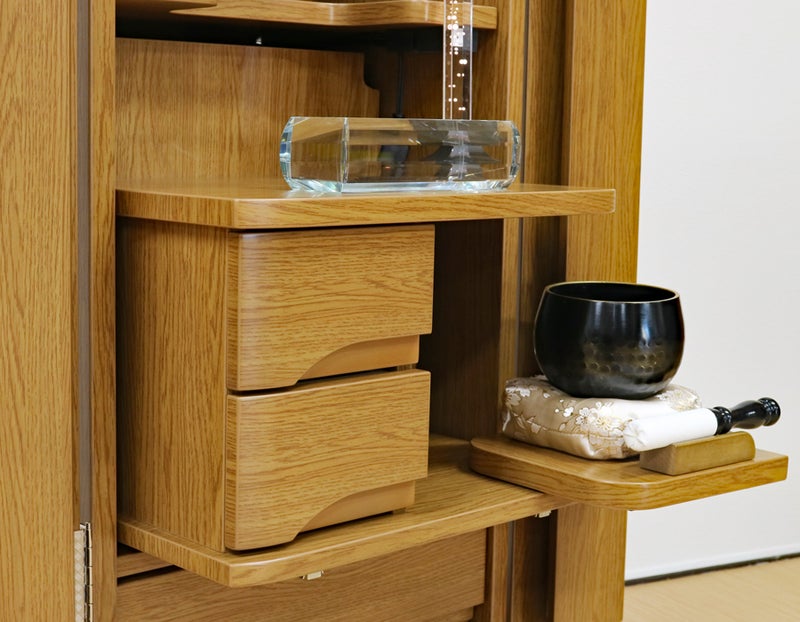 特装御本尊様にも対応した余裕ある設計。耐久性に優れたナラ調の美しさ。すべては、あなたが日々、最高の確信をもって出陣し、最高の結果をもって帰還するための「拠り所」として、誠実に造り上げられています。