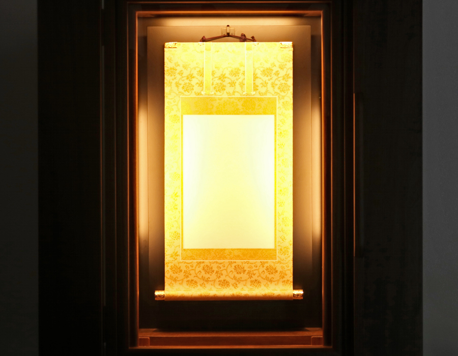 光の加減ができるLED照明を採用しご本尊様があたかも虚空に現れた演出をデザインしています。 ・ご本尊様は表装替え見本を使用 ・部屋を暗くして撮影