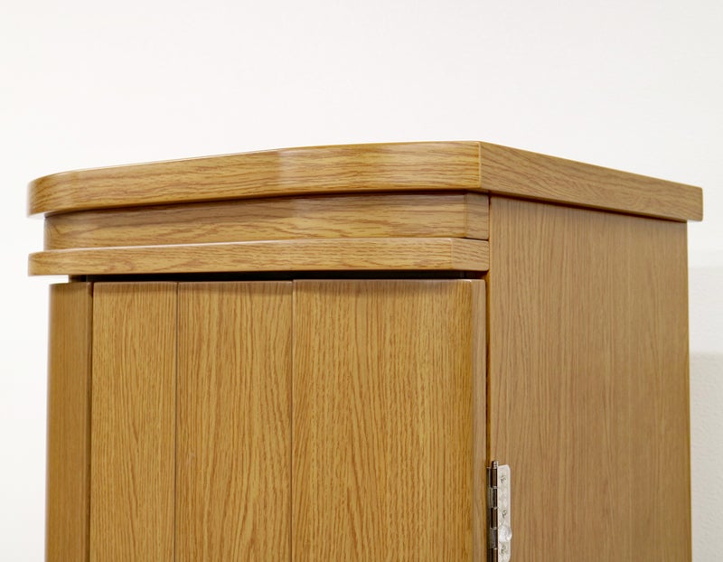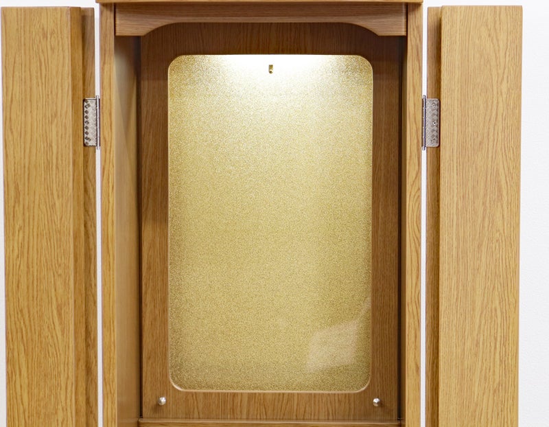 見てください、ナラ調の優しい木目に映えるアクリル厨子カバー。扉を閉めている時も、埃や煤(すす)から御本尊様をシャットアウトし、常に清浄な空間を保ちます。最新のプリント技術で仕上げられたボディは、変色に強くお手入れも簡単。