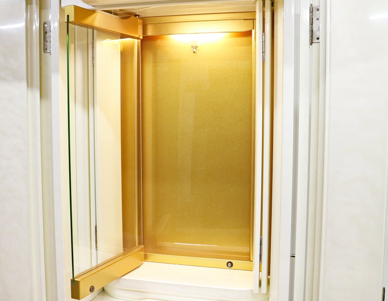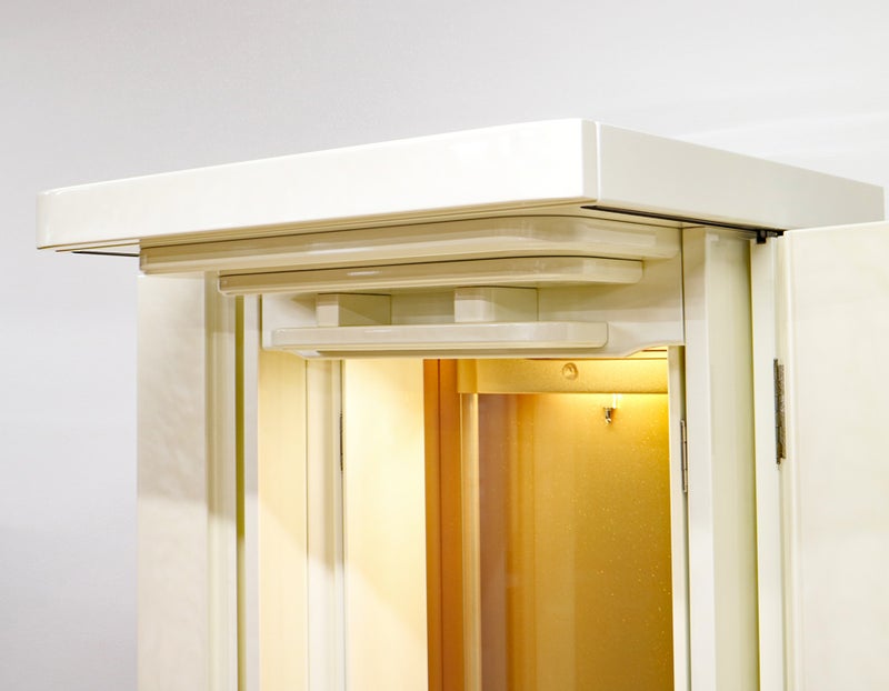 お厨子前面を強化ガラスで仕切ることで、御本尊様を護りながらも、お厨子内部の荘厳をより一層美しく浮かび上がらせます。透明感溢れる輝きが、唱題の姿勢を正してくれます。
