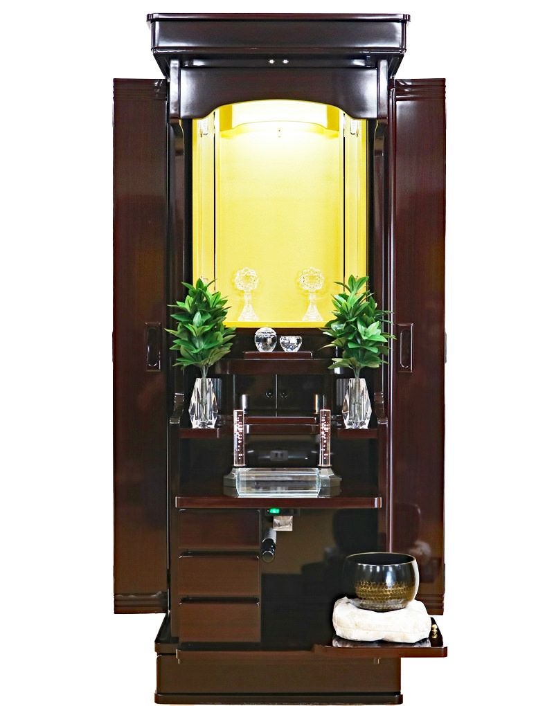 大切な御本尊様をゆとりを持って荘厳できるお厨子サイズ。静寂の中で開閉する電動扉が、毎日の勤行をドラマチックに演出。機能美と伝統が見事に融合した設計です。