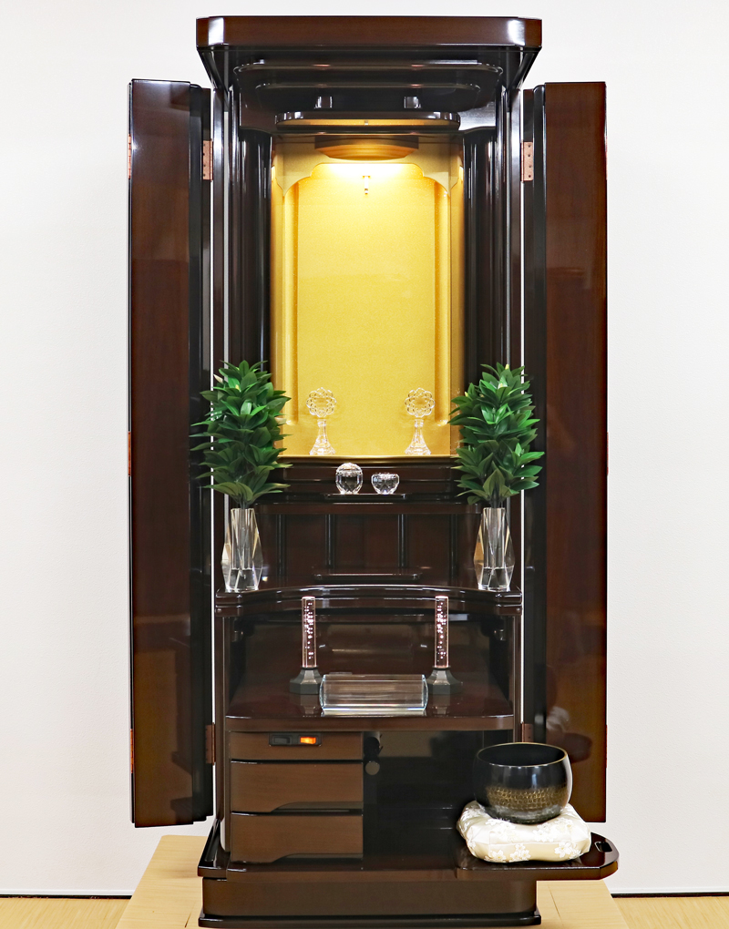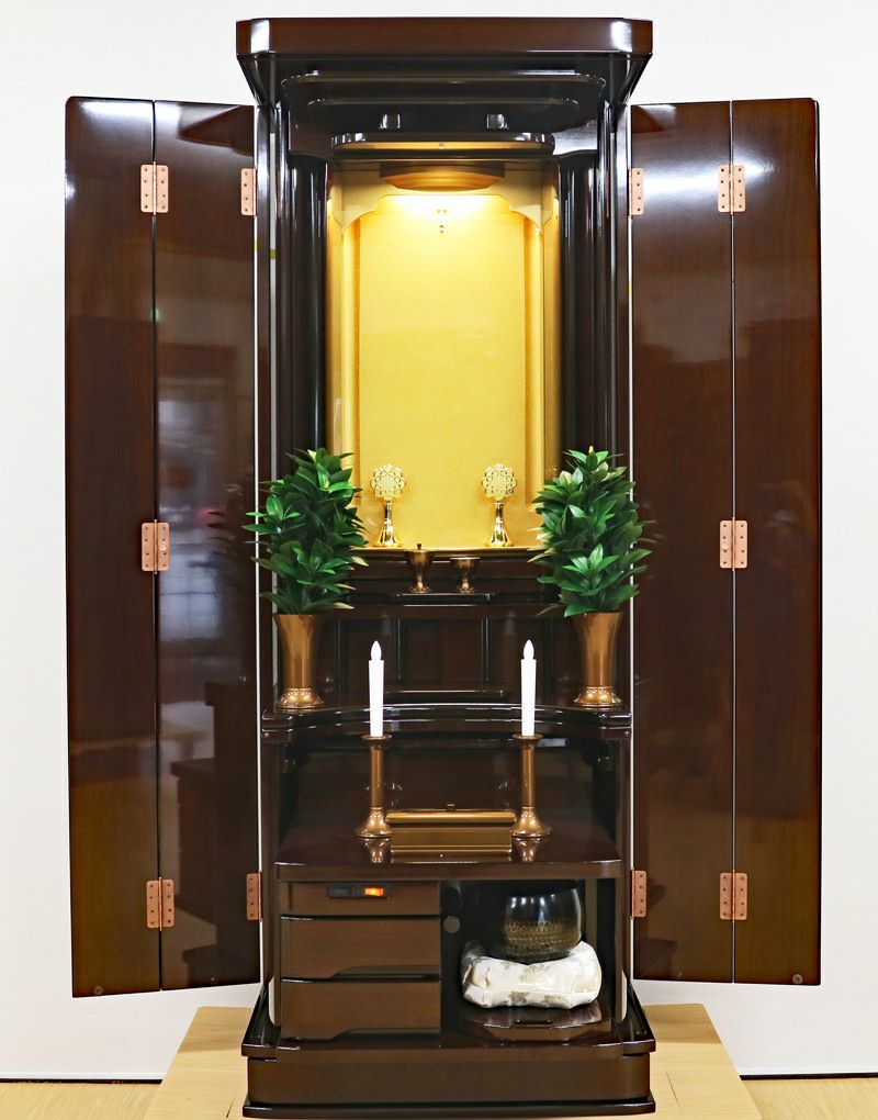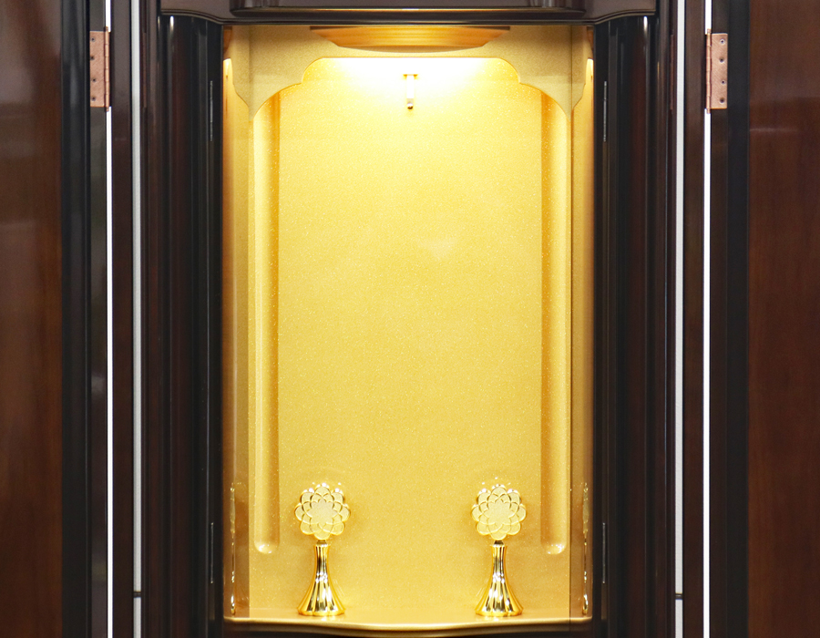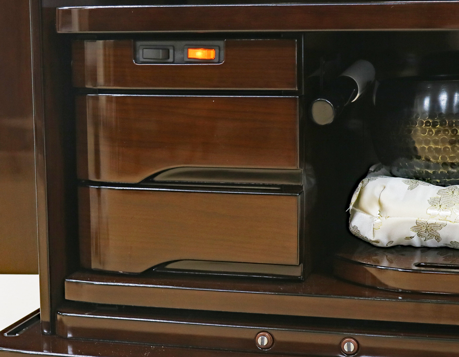 お仏壇内部に2箇所LED照明が設置されておりますので、ご本尊様を明るく拝すことができます。