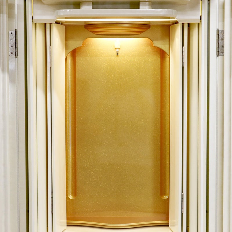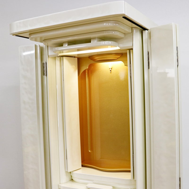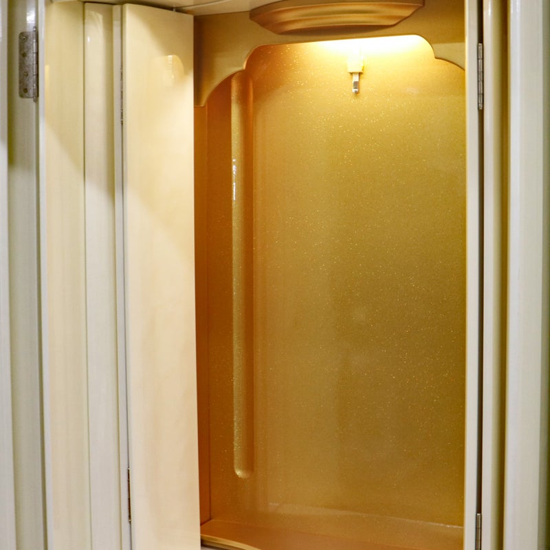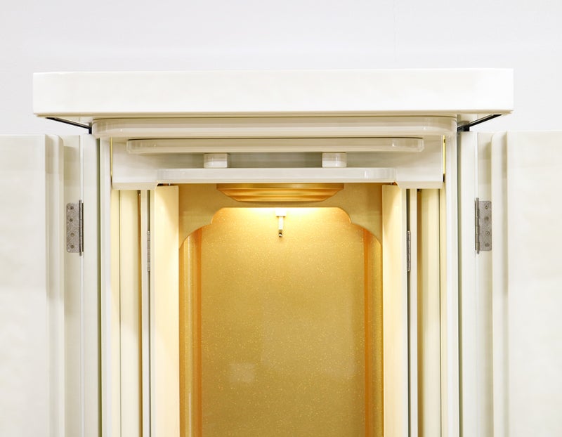 光の角度で繊細に表情を変えるパールの輝き。最新のプリント技術により変色に強く、日々のお手入れもサッと拭くだけ。常に磨き上げられた清々しい状態で御本尊様を荘厳できます。