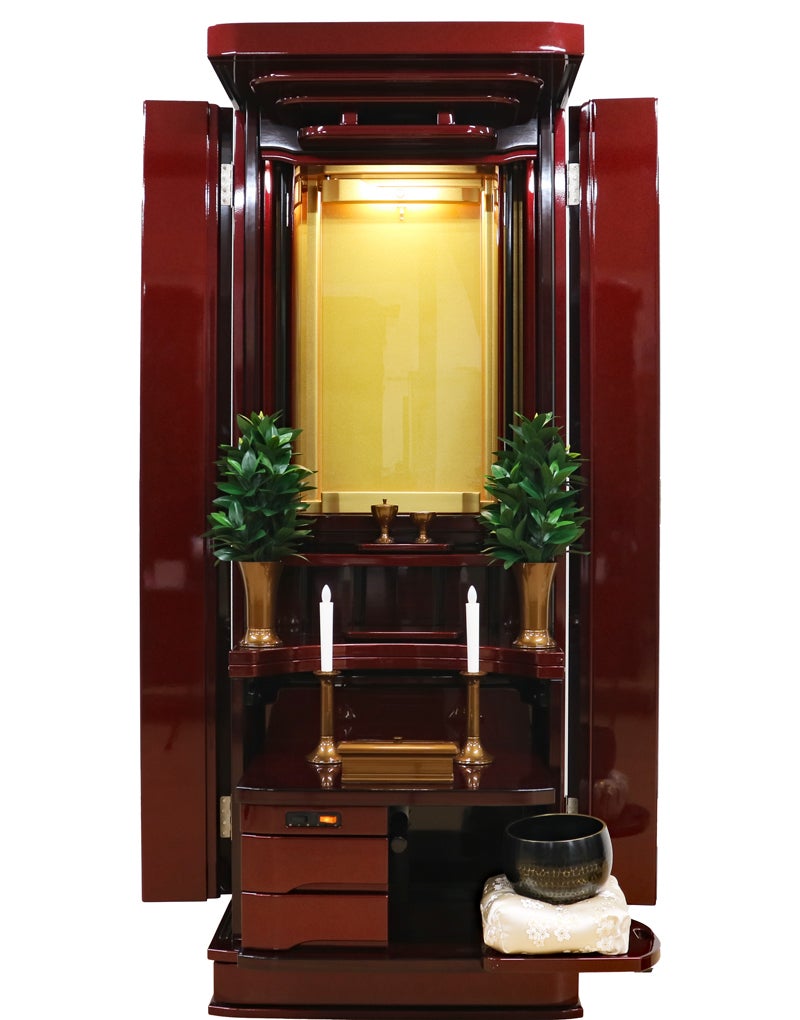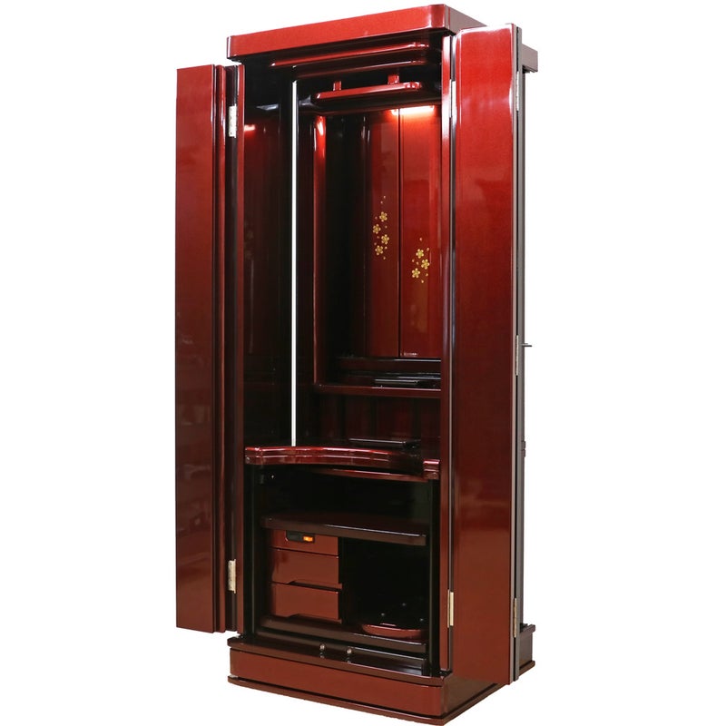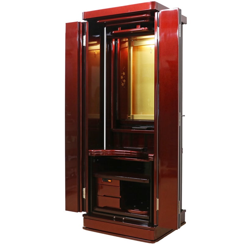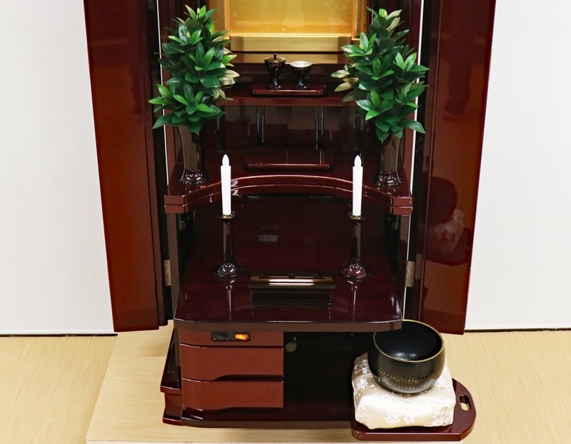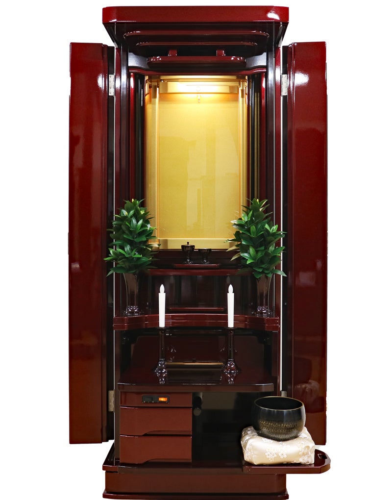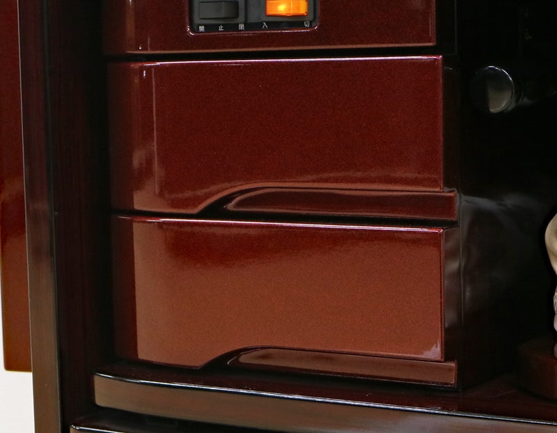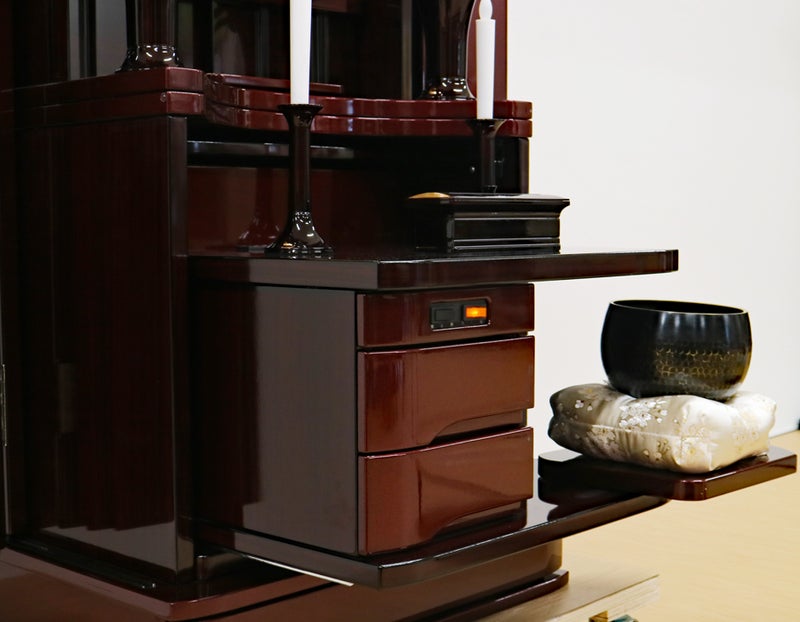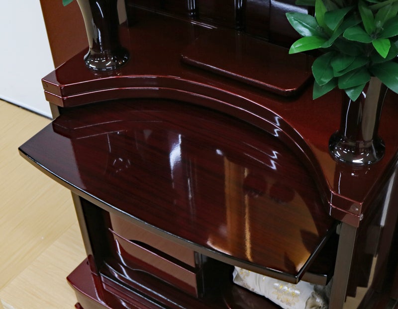 赤みの強い紫檀調の色彩が、お部屋に気品ある温かさと力強さをもたらします。最新プリント技術により変色に強く、日々のお手入れもサッと拭くだけ。常に磨き上げられた状態で御本尊様を荘厳できます。