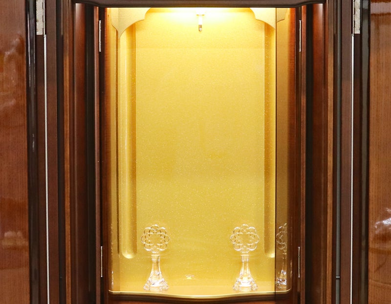 お厨子内部には、光を美しく乱反射させるレインボーゴールド塗装を採用。LED照明との相乗効果で、御本尊様をこの上なく明るく、高貴に荘厳します。一点集中の祈りを支える「黄金の聖域」です。