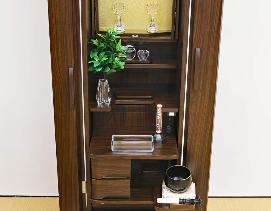 仏壇下部に3か所引き出しがございます。教本・お念珠が家族様の分まで収納可能です。