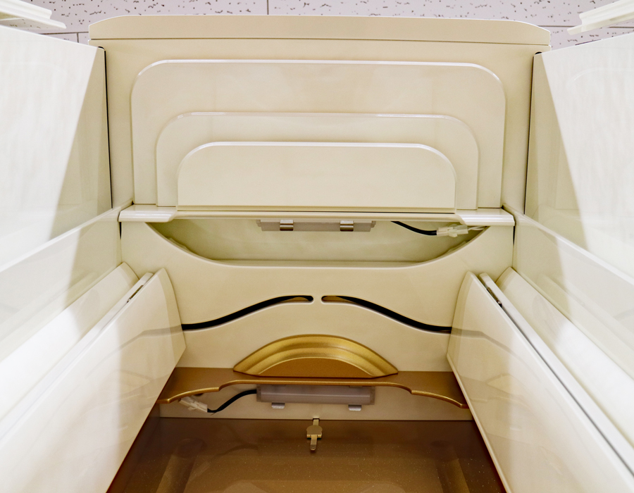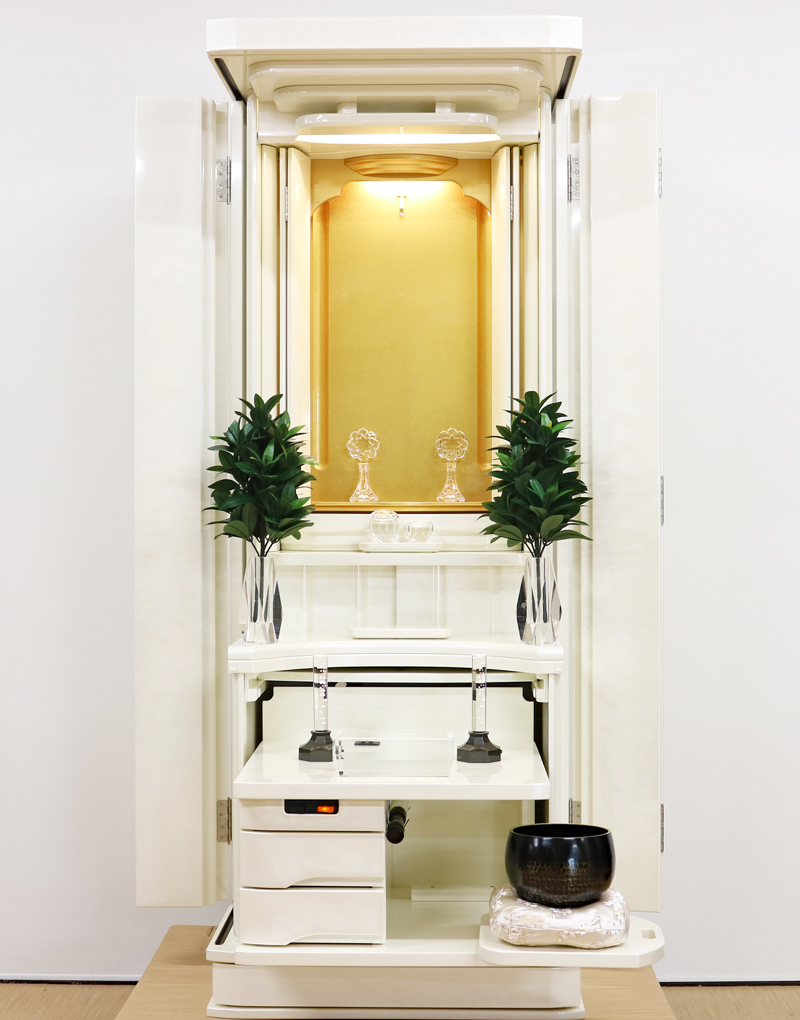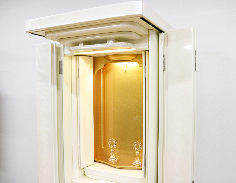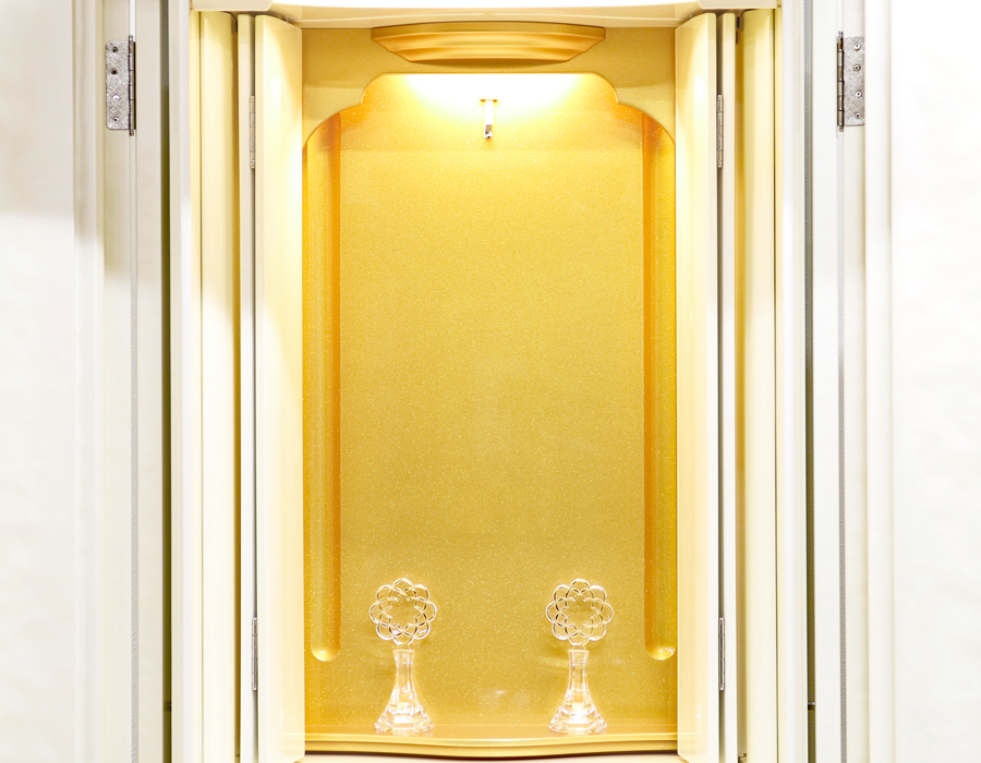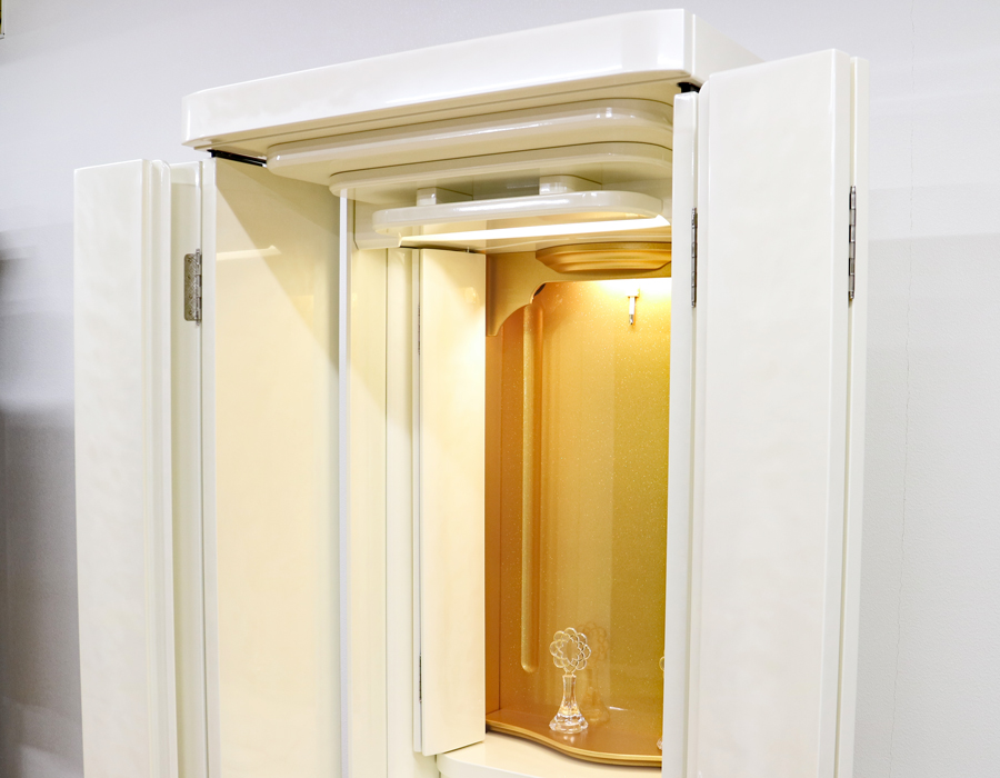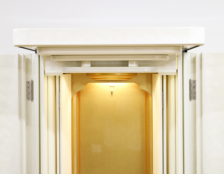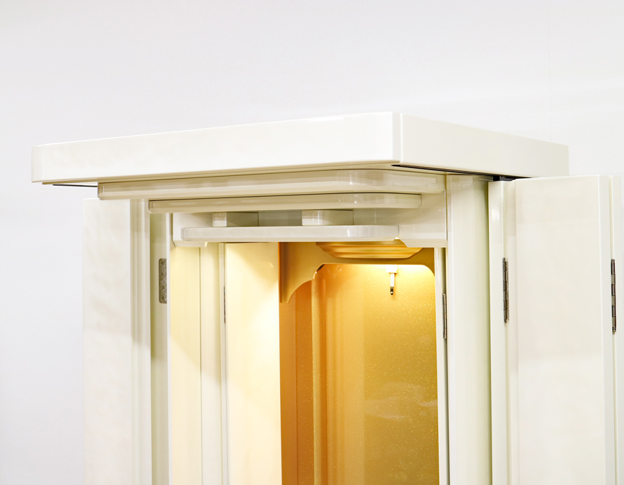 静かに開閉する電動厨子扉の音は、まるで心を落ち着かせる子守唄のよう。ご本尊様の穏やかなお姿に、心が安らぎます。グラデーションのあるパールホワイト塗装は、見る角度によって表情を変え、飽きさせません。 まるで雲海が光を浴びて輝いているよう。ご本尊様の後ろの金板には、特殊塗料と金粉を配合したレインボーゴールド塗装を施し、見る角度によって色が変化する幻想的な輝きを放ちます。押し込み式大戸は、お部屋のレイアウトに合わせて、自由な角度からご本尊様を拝むことができます。