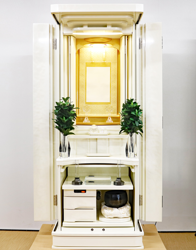 「時を超えて輝く、至高の美しさ。電動厨子扉が導く、新たな祈りの空間。静かに開閉する電動厨子扉の音は、まるで心を落ち着かせる子守唄のよう。ご本尊様の穏やかなお姿に、心が安らぎます。グラデーションのあるパールホワイト塗装は、見る角度によって表情を変え、飽きさせません。まるで雲海が光を浴びて輝いているよう。ご本尊様の後ろの金板には、特殊塗料と金粉を配合したレインボーゴールド塗装を施し、見る角度によって色が変化する幻想的な輝きを放ちます。押し込み式大戸は、お部屋のレイアウトに合わせて、自由な角度からご本尊様をお祀りいただけます。