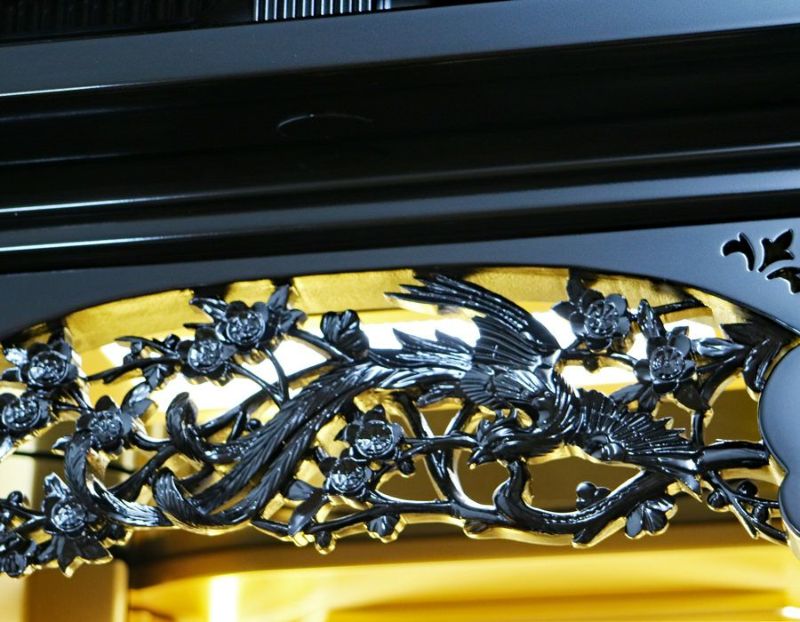 上部だけでなく両脇にもLED照明を配し、御本尊様を明るく清々しく浮かび上がらせます。お厨子内部の細工一つひとつに至るまで、広布の王者の城にふさわしい技が尽くされています。