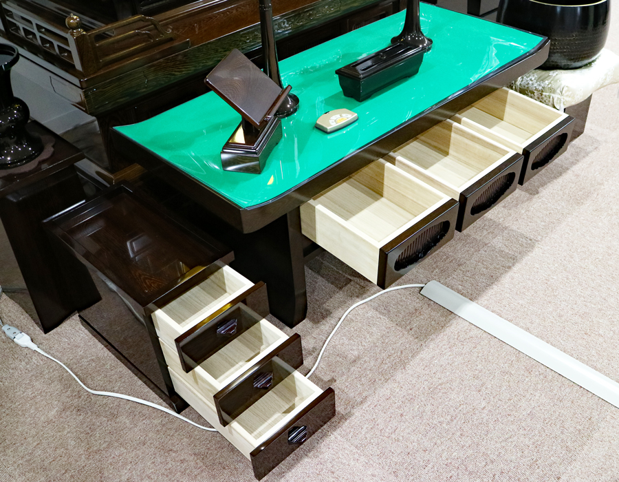 経机には引き出しが4箇所ございます。線香箱には、3か所引き出しがございます。
