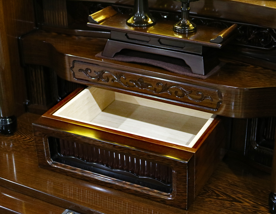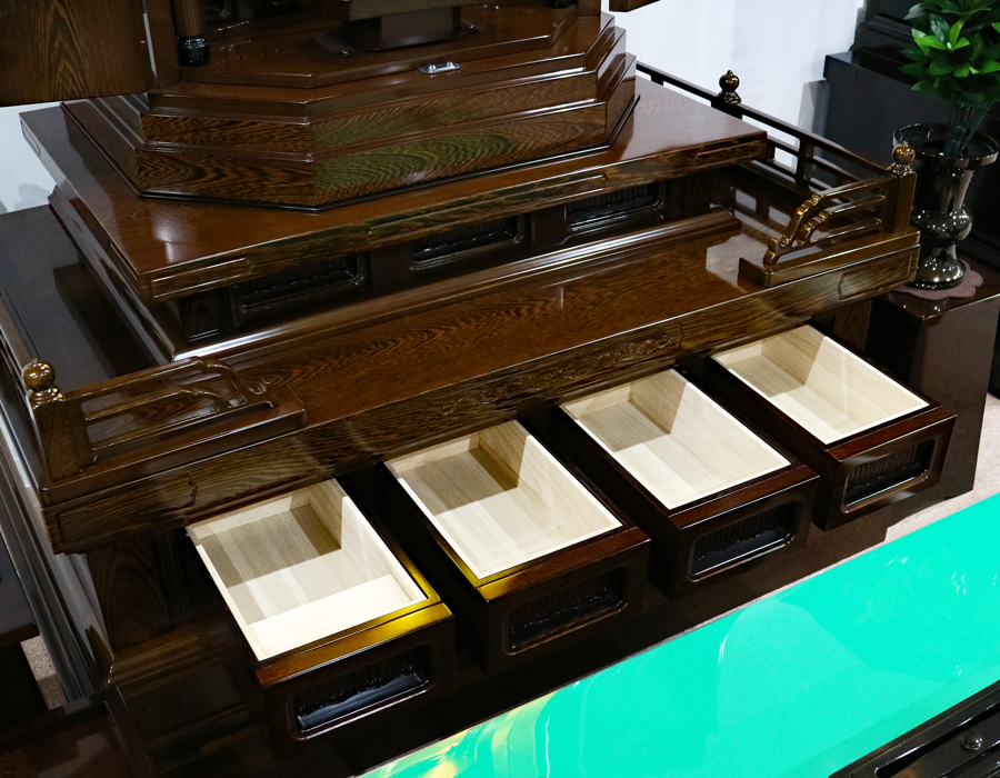 仏壇本体には、4か所の大きな引き出し収納が付いております。記念品・激励品等を大切に収納できます。