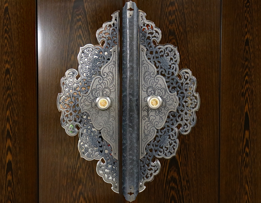 厨子扉は、高級いぶし銀を使用しております。こちらの金具は、二重になっております。金具の取っ手までこだわって作成されております。