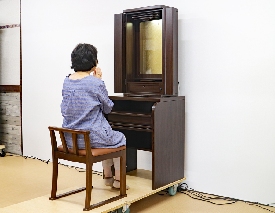椅子に座ると、ちょうど良い高さにご本尊様がくるように設計されています。忙しい毎日の中でも、気軽に座ってご本尊様と向き合い、心の平安を取り戻すことができます。