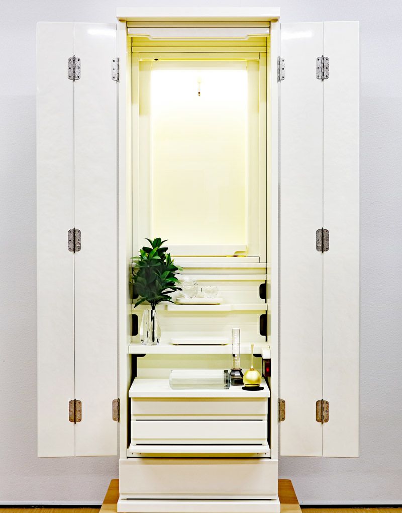 仏壇正面部分(お仏壇閉じた状態)にグラデーションのある特殊なパールホワイト塗装が施された高級感あふれるデザインに仕上がっております。