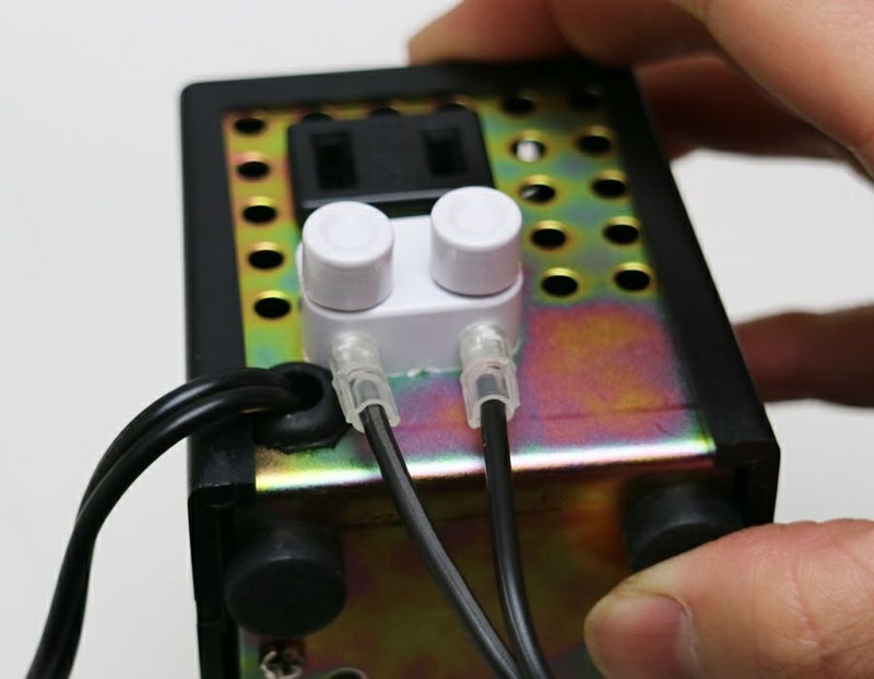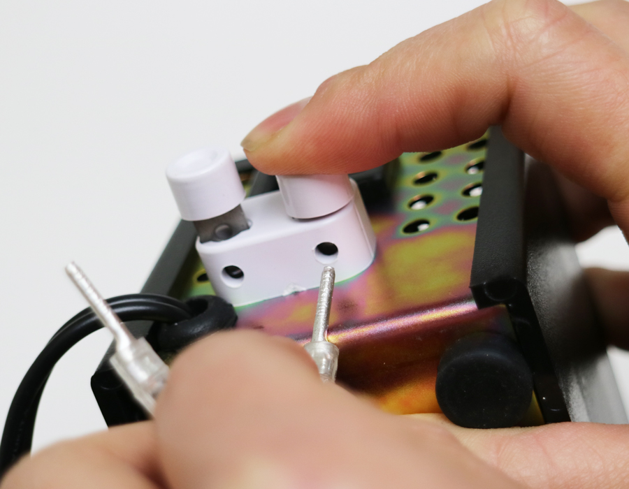 スイッチボックス裏にある、白いボタンを押し込みながら、LED照明から繋がっている導線を差し込みます。
