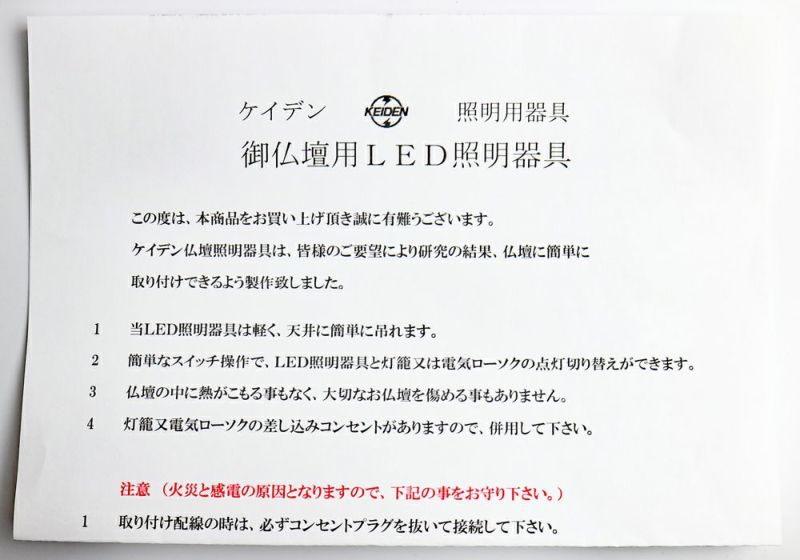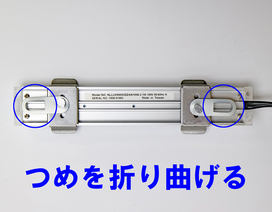 上記お写真の青丸の箇所(LED照明の裏側の金具)を折り曲げて、お仏壇内天井に設置した、付属のフックネジをひっかけてLED照明を吊るすことができます。