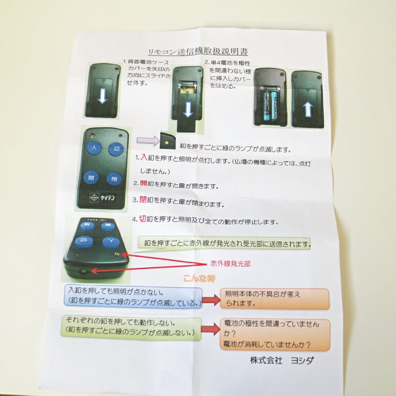 ※受信機のないお仏壇、又は受信機が壊れている場合や対象のリモコンでない場合は作動いたしません。