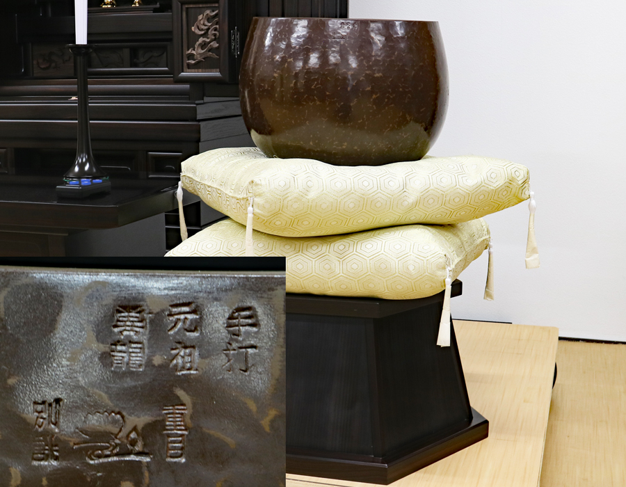 付属のリンは、高さ24.5cm x 口径28.5cm(9号)の手打ちの最高級のリンになります「善龍」が付属いたします。
