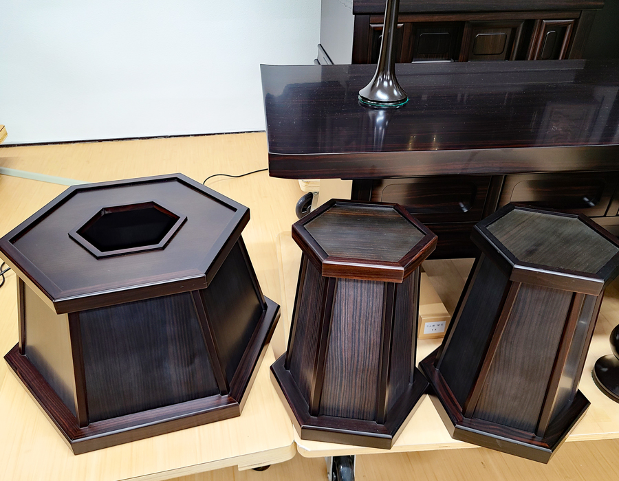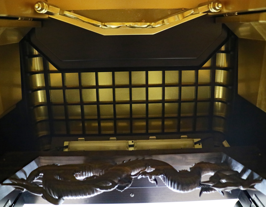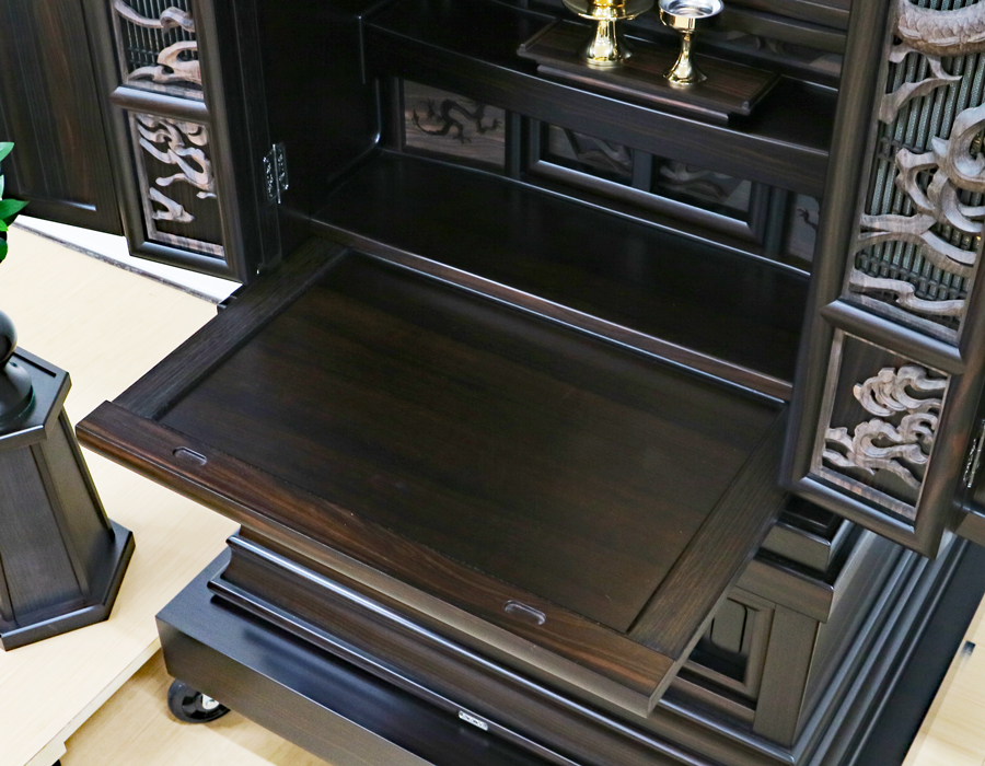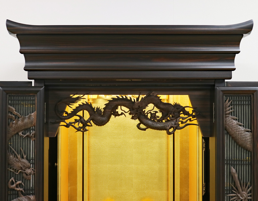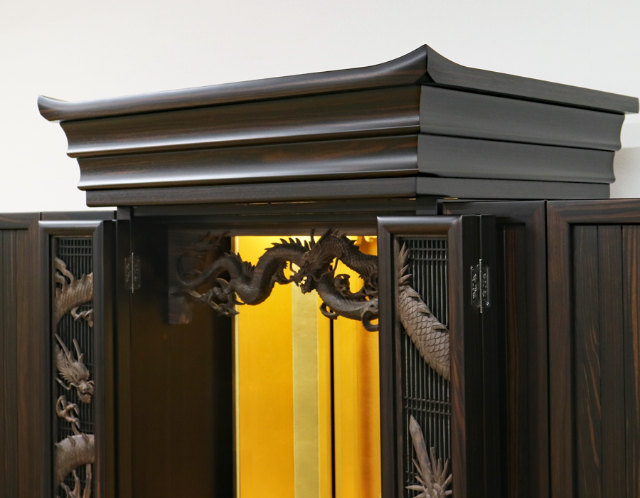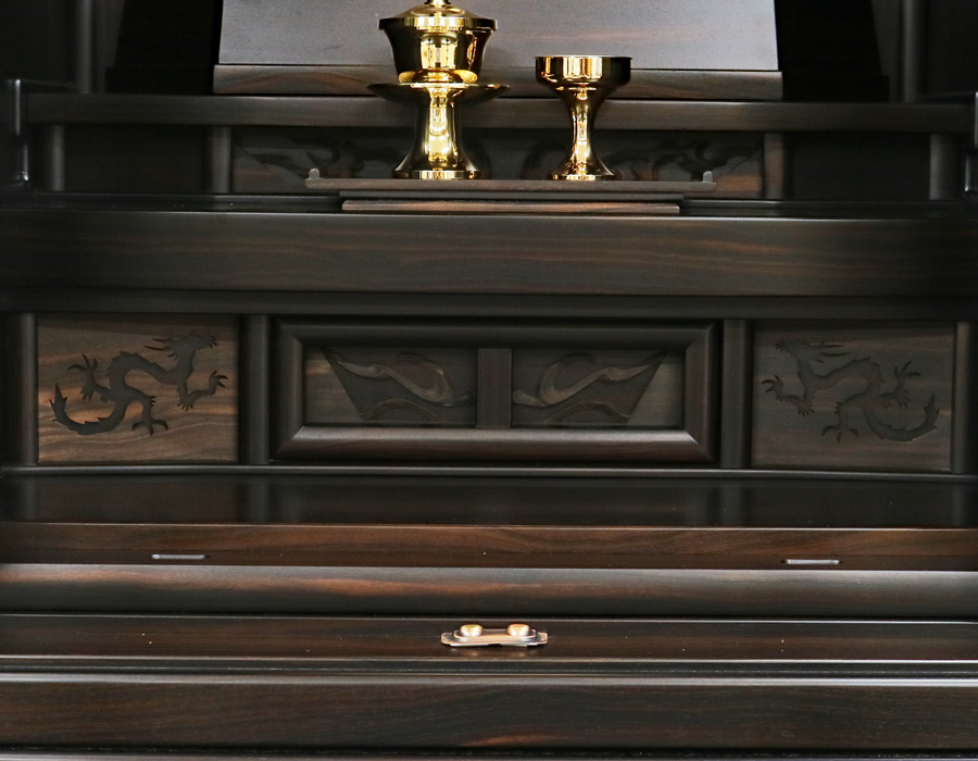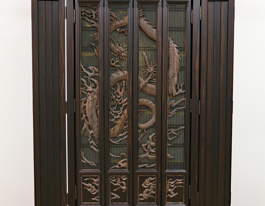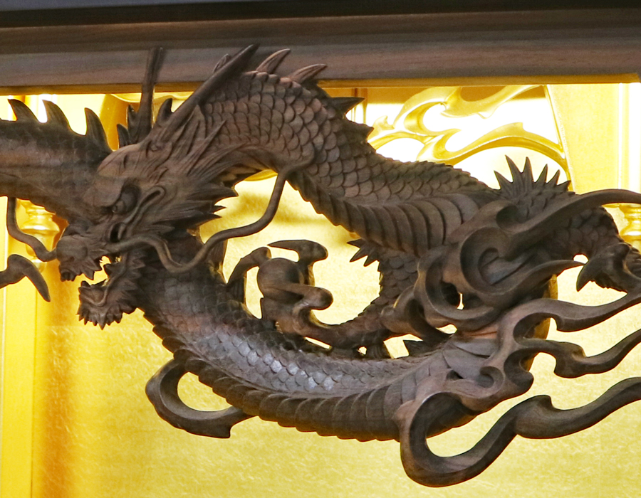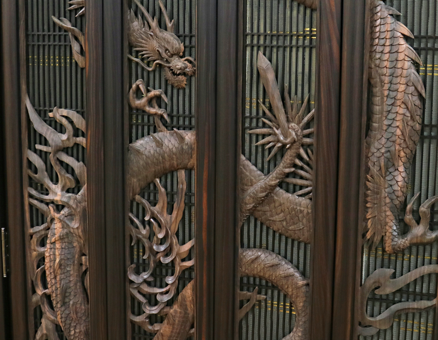 黒檀の無垢板をふんだんに使用して、龍の彫りを立体的に仕上げております。