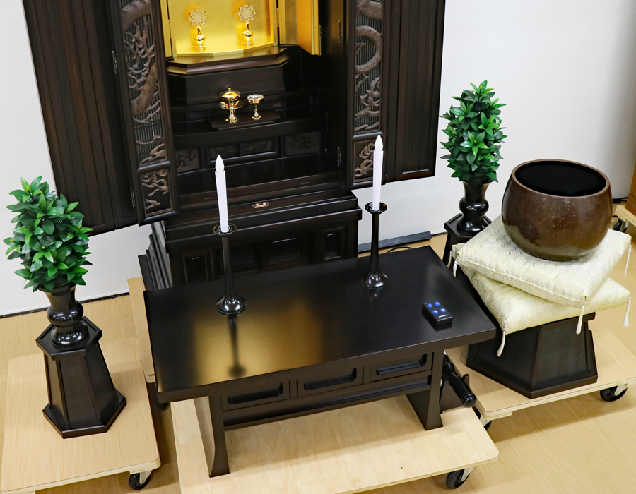 中古:天目・灯立×2・花立×2・リン・リン布団×2・花台×2・リン台・リン棒台・経机・リモコン