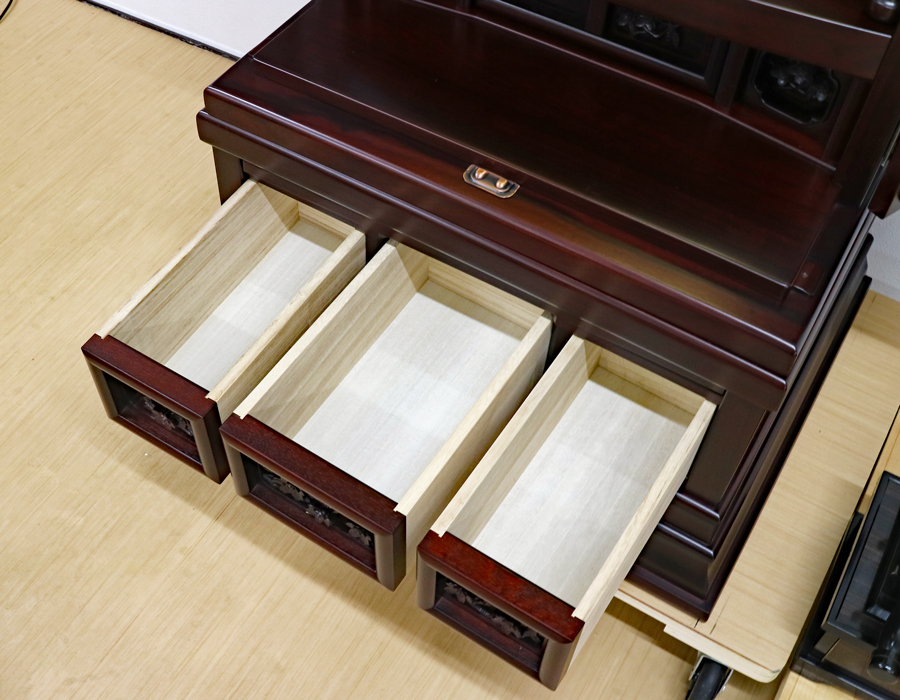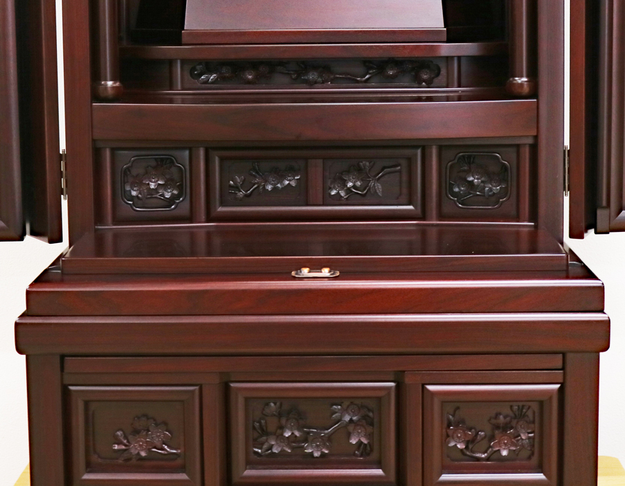 グラナディロ材をふんだんに使用して、欄間・引き出し等に見事な桜の彫りが立体的に仕上げております。
