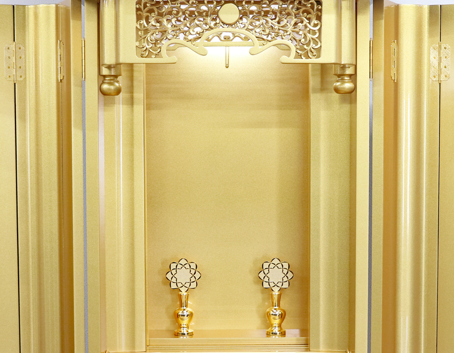 お厨子を開くと美しくクリア金色塗装の厨子板がご本尊様をさらに荘厳にしてくれます。 内部にはLED照明も付属していますのでご本尊様を明るく照らしてくれます。