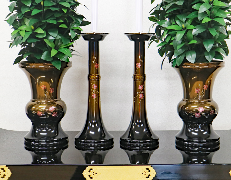 付属の仏具は銅器生産で有名な、高岡製のさくら彫金入りの最高級仏具が付属いたします。