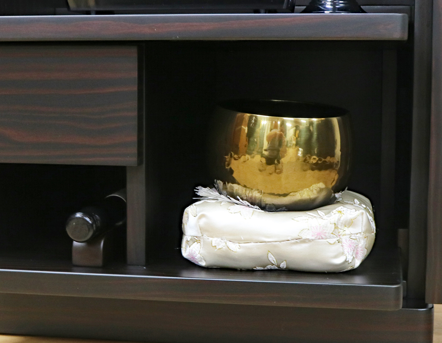 仏具付きを選択の場合、上記お写真のボカシ色の3.5寸(口径約10.5cm)のリンが付属いたします。