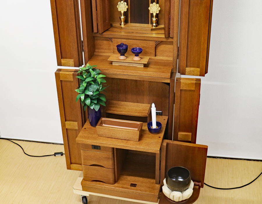 大戸が三方開きになるお仏壇ですので、三方開きにすると視野が広がり斜めからでも御本尊様を拝すことができます。