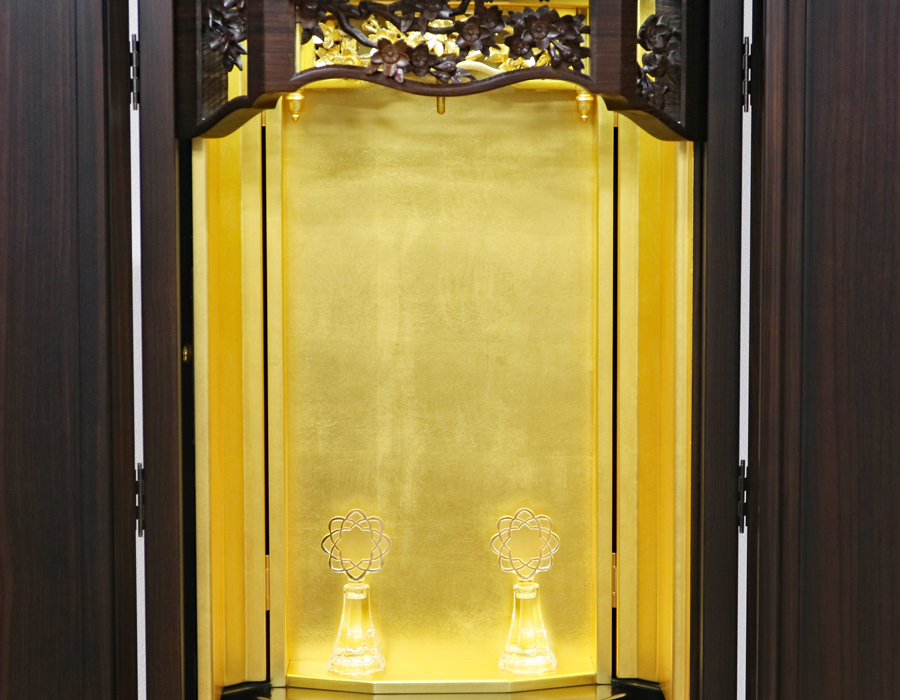 本金箔と金色塗装では輝きが違うのは一目瞭然です。 内部には蛍光灯照明も付属していますのでご本尊様を明るく照らしてくれます。