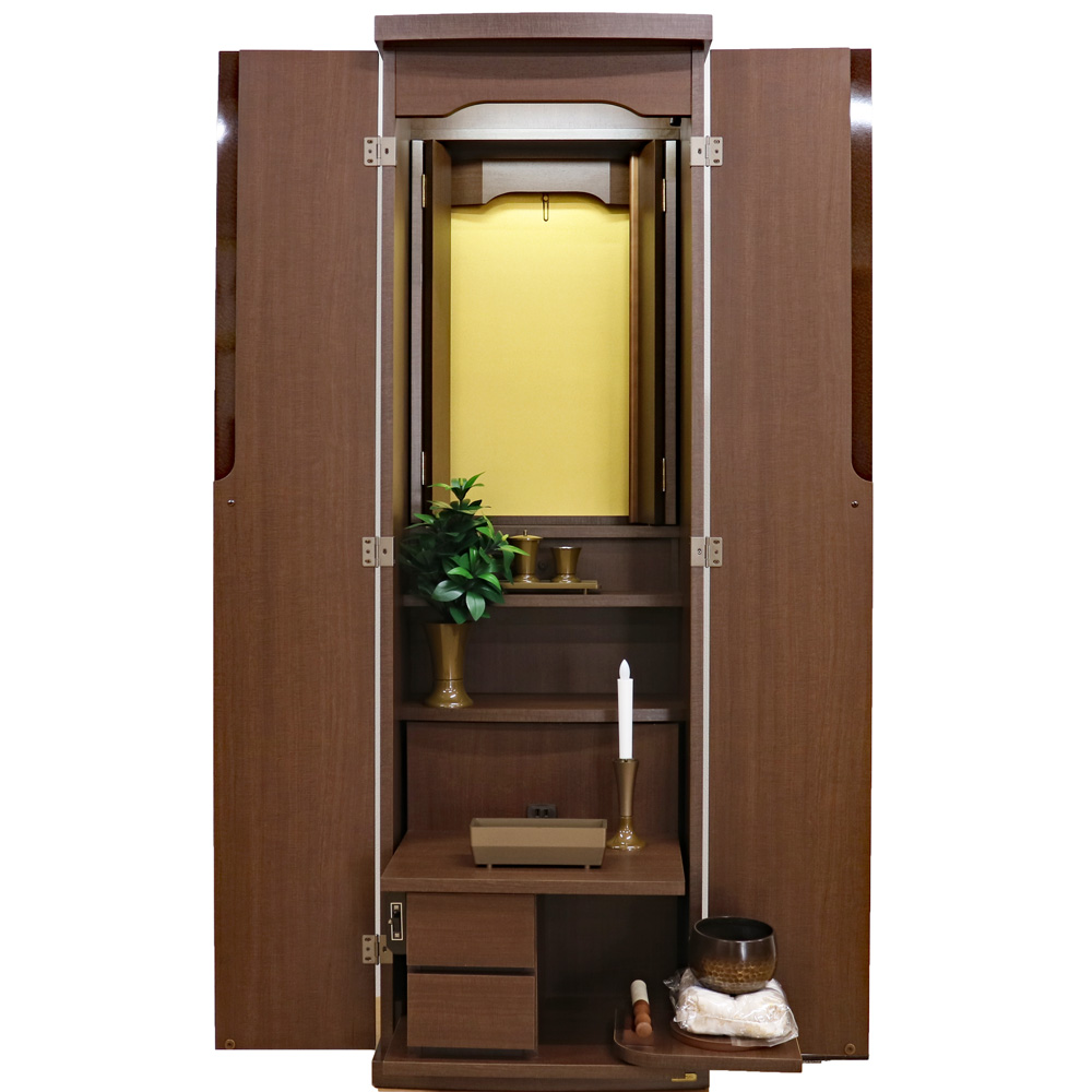 想像してみてください。 この高品質なブラウン仏壇をあなたの家へ迎え、初めて扉を開く瞬間を。 あなたの大切な御本尊様がそこにご安置され、その御本尊に向かい、朗々と題目をあげることができるのです。 それはあなた自身で御本尊様を最高に荘厳にしたご供養であり、自身の生命を題目で荘厳する「功徳善根」の行動を起こすことになります。その歓喜の生命は、あなた自身の内なる仏界を涌現させ、あふれんばかりの生命力で、これまでの宿命を使命へと転じ、さらなる人間革命のドラマを書き換える大きな一歩へと繋がっていくのです。